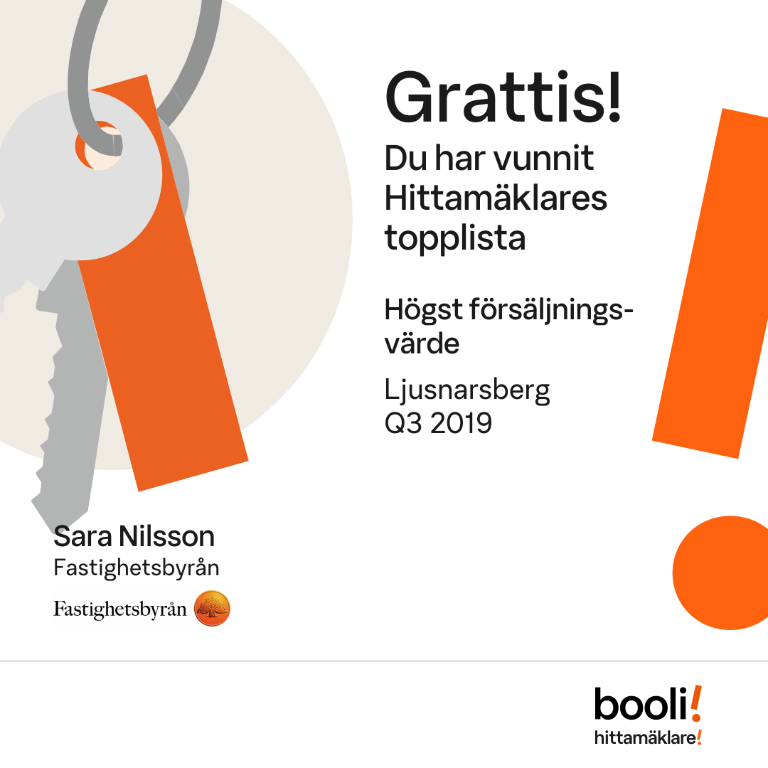 Statistik för publicerade bostäder, försäljningar och omdömen baseras på data från Booli och Hittamäklare. Statistiken för försäljningar avser inrapporterade och verifierade slutpriser från mäklare eller av Booli inhämtade och verifierade slutpriser. Statistiken för publicerade bostäder baseras på information som publicerats på Booli.se. Statistik för omdömen och rekommendationer baseras på omdömen från säljare som lämnats via Booli och Hittamäklare.
