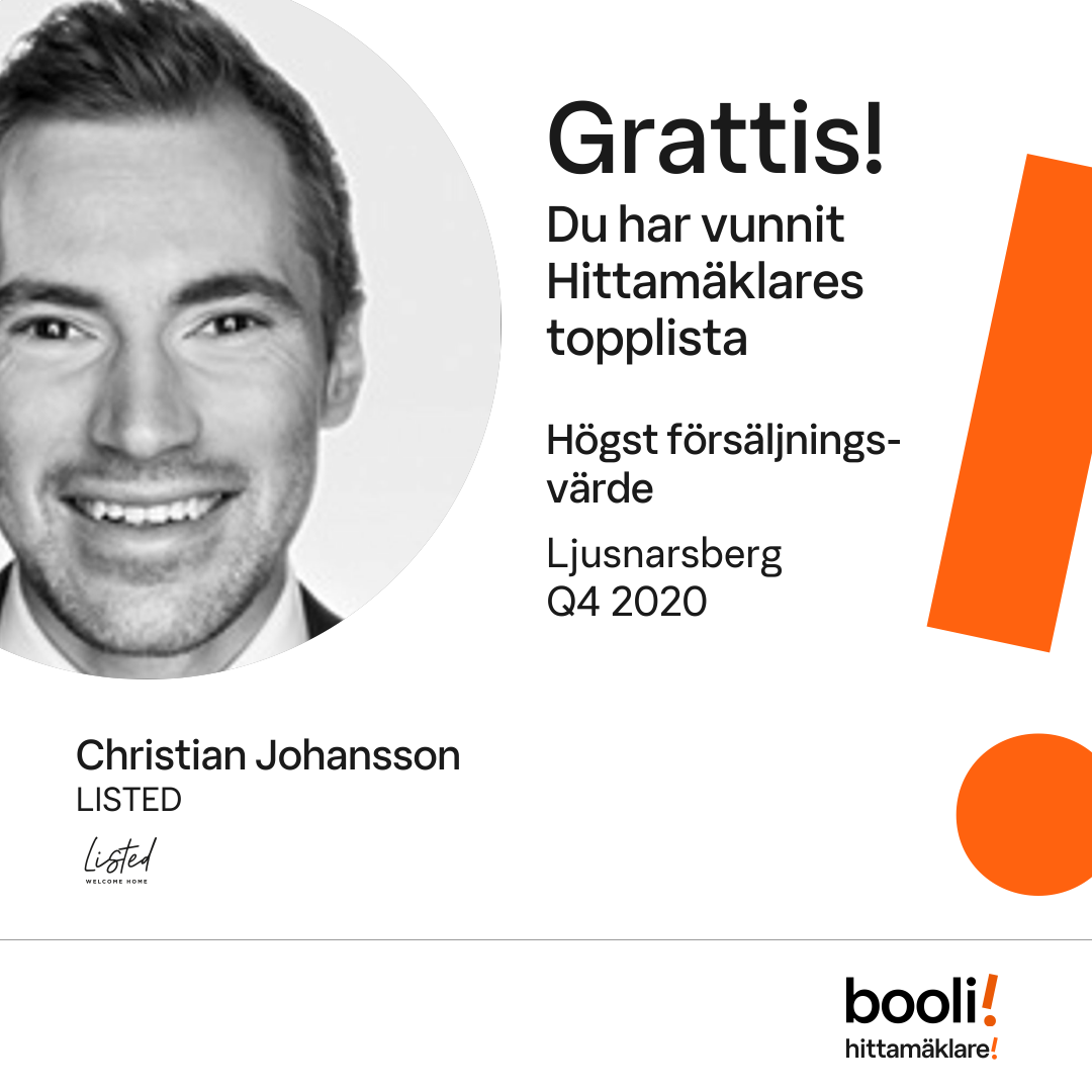 Statistik för publicerade bostäder, försäljningar och omdömen baseras på data från Booli och Hittamäklare. Statistiken för försäljningar avser inrapporterade och verifierade slutpriser från mäklare eller av Booli inhämtade och verifierade slutpriser. Statistiken för publicerade bostäder baseras på information som publicerats på Booli.se. Statistik för omdömen och rekommendationer baseras på omdömen från säljare som lämnats via Booli och Hittamäklare.