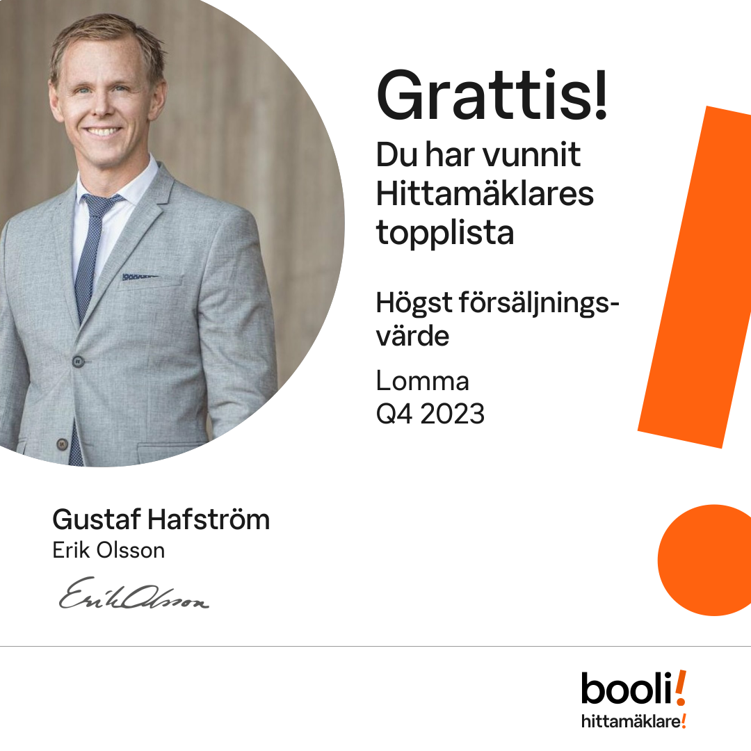 Statistik för publicerade bostäder, försäljningar och omdömen baseras på data från Booli och Hittamäklare. Statistiken för försäljningar avser inrapporterade och verifierade slutpriser från mäklare eller av Booli inhämtade och verifierade slutpriser. Statistiken för publicerade bostäder baseras på information som publicerats på Booli.se. Statistik för omdömen och rekommendationer baseras på omdömen från säljare som lämnats via Booli och Hittamäklare.
