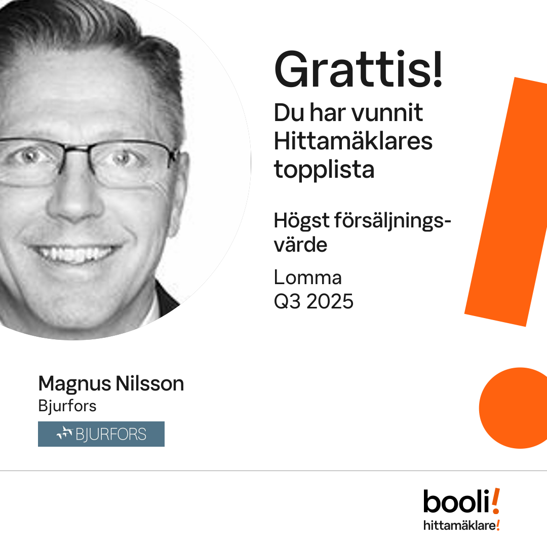 Statistik för publicerade bostäder, försäljningar och omdömen baseras på data från Booli och Hittamäklare. Statistiken för försäljningar avser inrapporterade och verifierade slutpriser från mäklare eller av Booli inhämtade och verifierade slutpriser. Statistiken för publicerade bostäder baseras på information som publicerats på Booli.se. Statistik för omdömen och rekommendationer baseras på omdömen från säljare som lämnats via Booli och Hittamäklare.