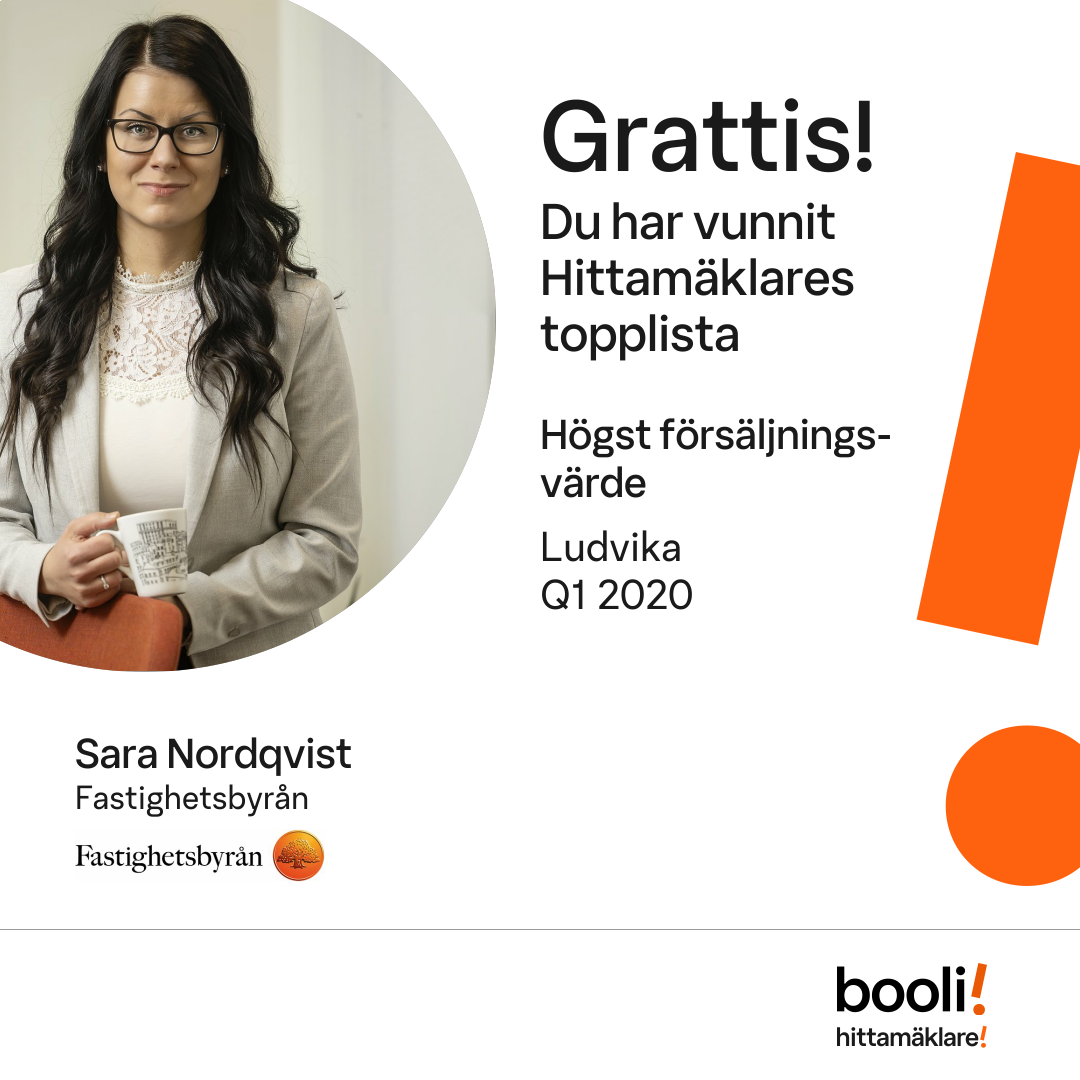 Statistik för publicerade bostäder, försäljningar och omdömen baseras på data från Booli och Hittamäklare. Statistiken för försäljningar avser inrapporterade och verifierade slutpriser från mäklare eller av Booli inhämtade och verifierade slutpriser. Statistiken för publicerade bostäder baseras på information som publicerats på Booli.se. Statistik för omdömen och rekommendationer baseras på omdömen från säljare som lämnats via Booli och Hittamäklare.