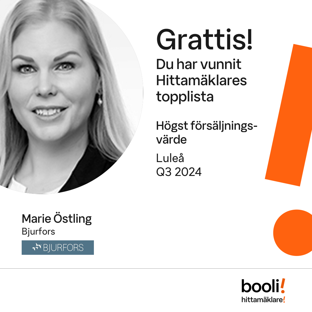 Statistik för publicerade bostäder, försäljningar och omdömen baseras på data från Booli och Hittamäklare. Statistiken för försäljningar avser inrapporterade och verifierade slutpriser från mäklare eller av Booli inhämtade och verifierade slutpriser. Statistiken för publicerade bostäder baseras på information som publicerats på Booli.se. Statistik för omdömen och rekommendationer baseras på omdömen från säljare som lämnats via Booli och Hittamäklare.