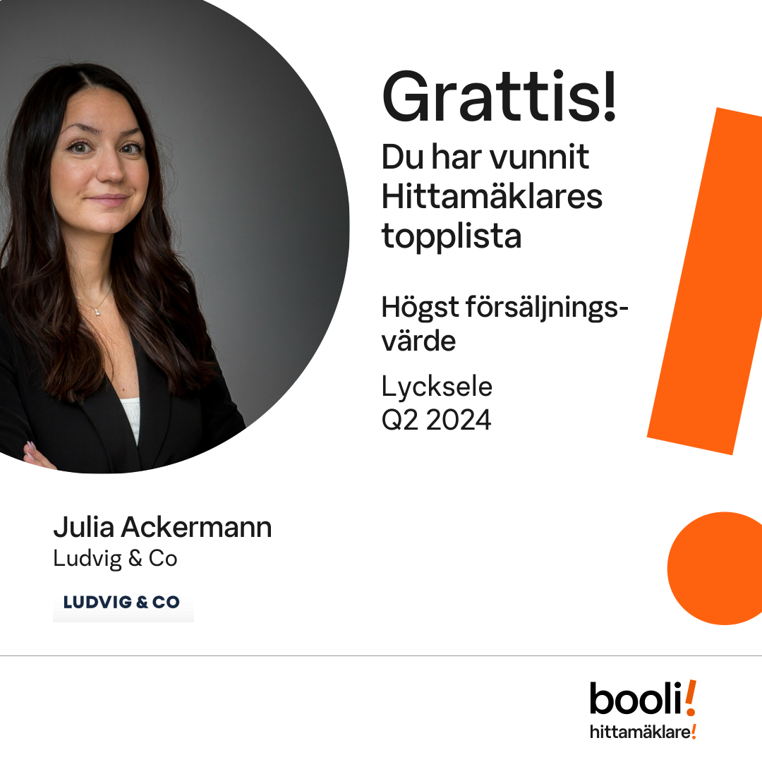 Statistik för publicerade bostäder, försäljningar och omdömen baseras på data från Booli och Hittamäklare. Statistiken för försäljningar avser inrapporterade och verifierade slutpriser från mäklare eller av Booli inhämtade och verifierade slutpriser. Statistiken för publicerade bostäder baseras på information som publicerats på Booli.se. Statistik för omdömen och rekommendationer baseras på omdömen från säljare som lämnats via Booli och Hittamäklare.
