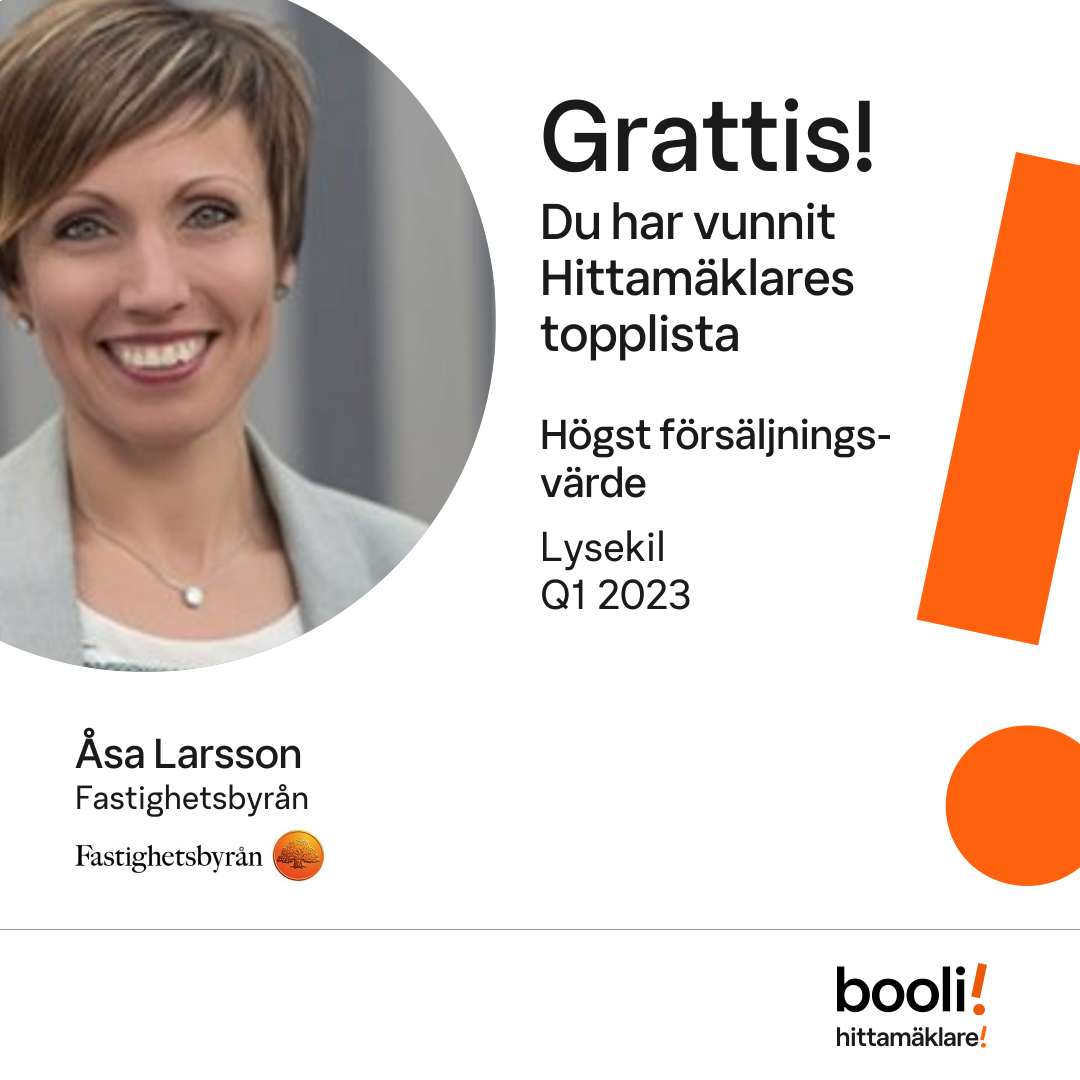 Statistik för publicerade bostäder, försäljningar och omdömen baseras på data från Booli och Hittamäklare. Statistiken för försäljningar avser inrapporterade och verifierade slutpriser från mäklare eller av Booli inhämtade och verifierade slutpriser. Statistiken för publicerade bostäder baseras på information som publicerats på Booli.se. Statistik för omdömen och rekommendationer baseras på omdömen från säljare som lämnats via Booli och Hittamäklare.