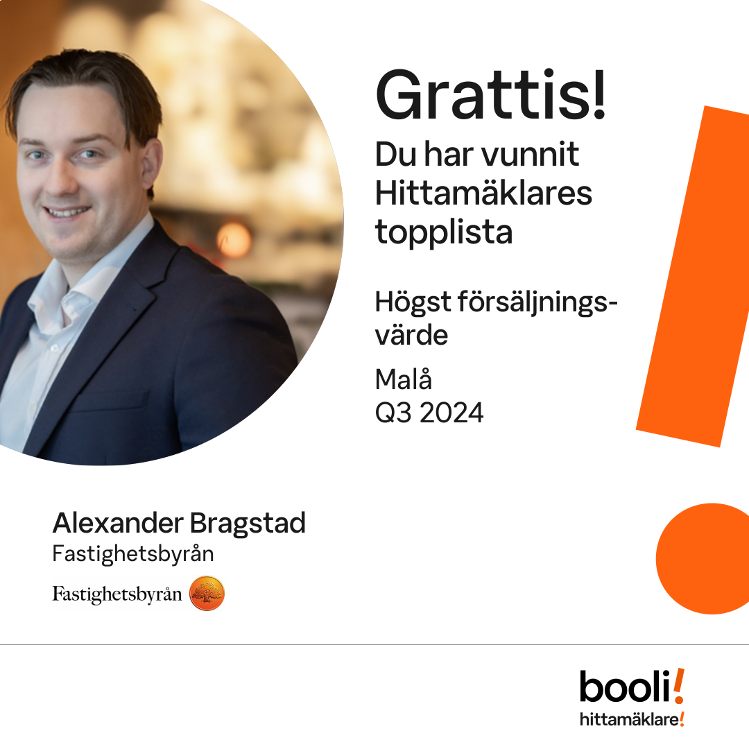 Statistik för publicerade bostäder, försäljningar och omdömen baseras på data från Booli och Hittamäklare. Statistiken för försäljningar avser inrapporterade och verifierade slutpriser från mäklare eller av Booli inhämtade och verifierade slutpriser. Statistiken för publicerade bostäder baseras på information som publicerats på Booli.se. Statistik för omdömen och rekommendationer baseras på omdömen från säljare som lämnats via Booli och Hittamäklare.