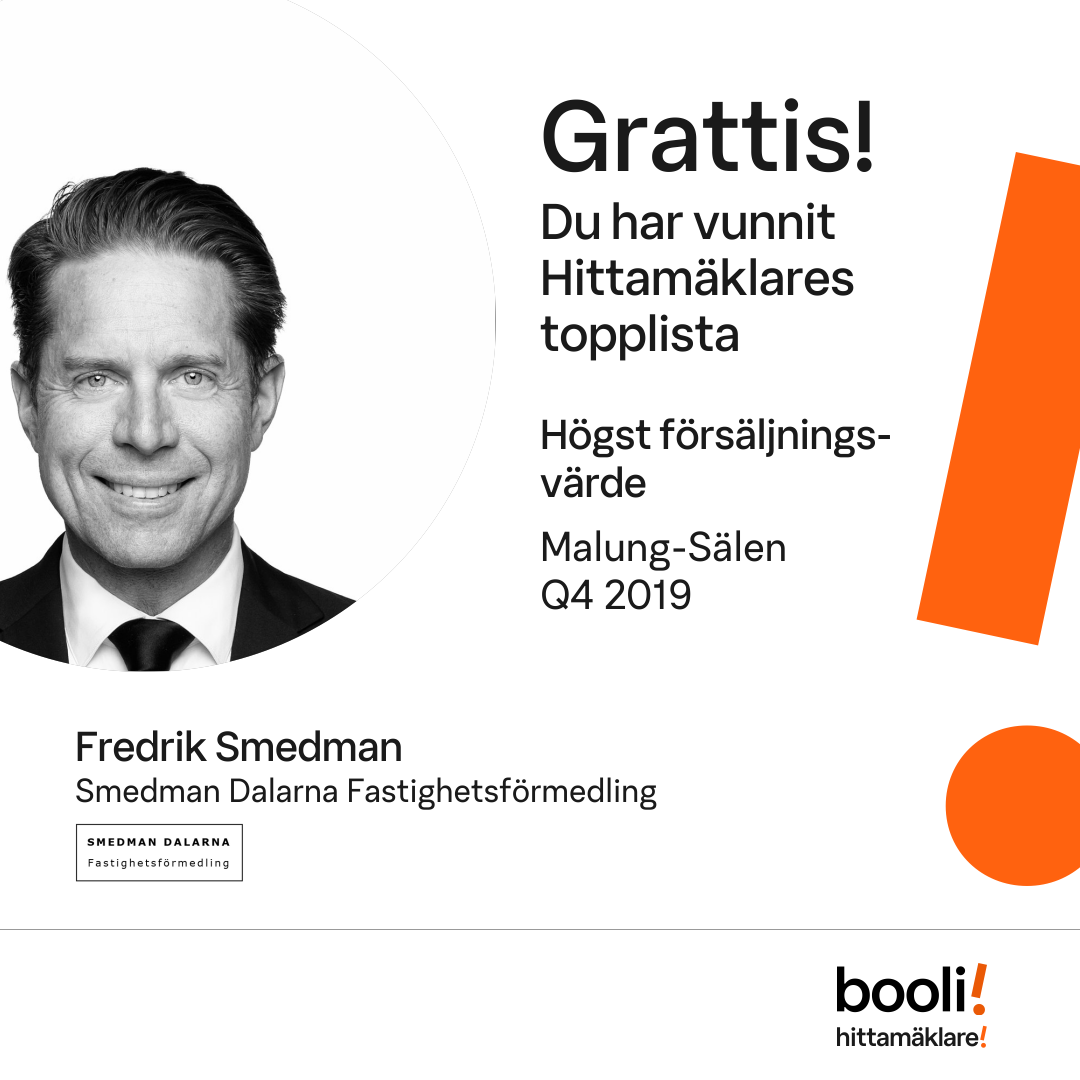 Statistik för publicerade bostäder, försäljningar och omdömen baseras på data från Booli och Hittamäklare. Statistiken för försäljningar avser inrapporterade och verifierade slutpriser från mäklare eller av Booli inhämtade och verifierade slutpriser. Statistiken för publicerade bostäder baseras på information som publicerats på Booli.se. Statistik för omdömen och rekommendationer baseras på omdömen från säljare som lämnats via Booli och Hittamäklare.