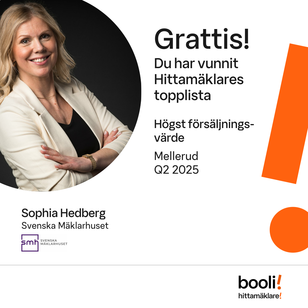 Statistik för publicerade bostäder, försäljningar och omdömen baseras på data från Booli och Hittamäklare. Statistiken för försäljningar avser inrapporterade och verifierade slutpriser från mäklare eller av Booli inhämtade och verifierade slutpriser. Statistiken för publicerade bostäder baseras på information som publicerats på Booli.se. Statistik för omdömen och rekommendationer baseras på omdömen från säljare som lämnats via Booli och Hittamäklare.