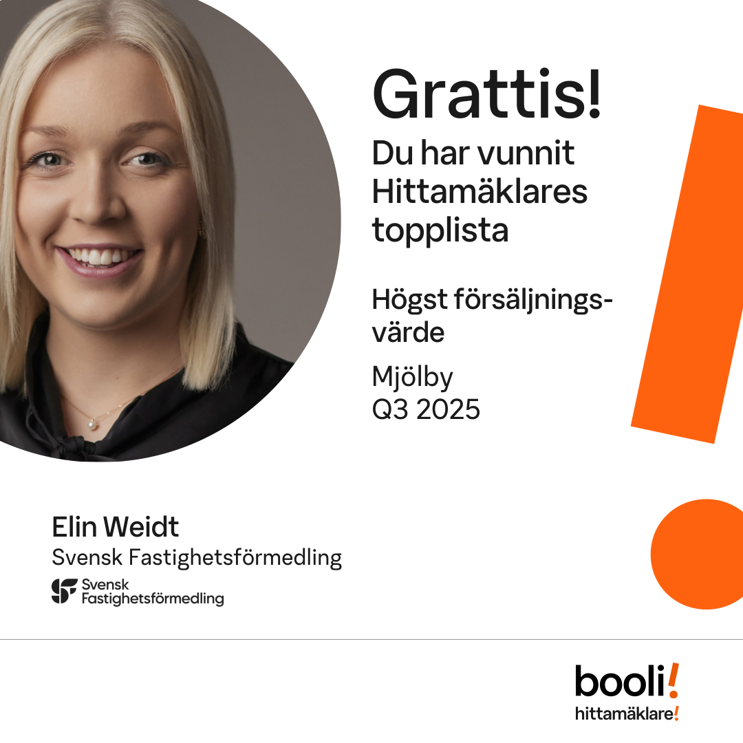 Statistik för publicerade bostäder, försäljningar och omdömen baseras på data från Booli och Hittamäklare. Statistiken för försäljningar avser inrapporterade och verifierade slutpriser från mäklare eller av Booli inhämtade och verifierade slutpriser. Statistiken för publicerade bostäder baseras på information som publicerats på Booli.se. Statistik för omdömen och rekommendationer baseras på omdömen från säljare som lämnats via Booli och Hittamäklare.