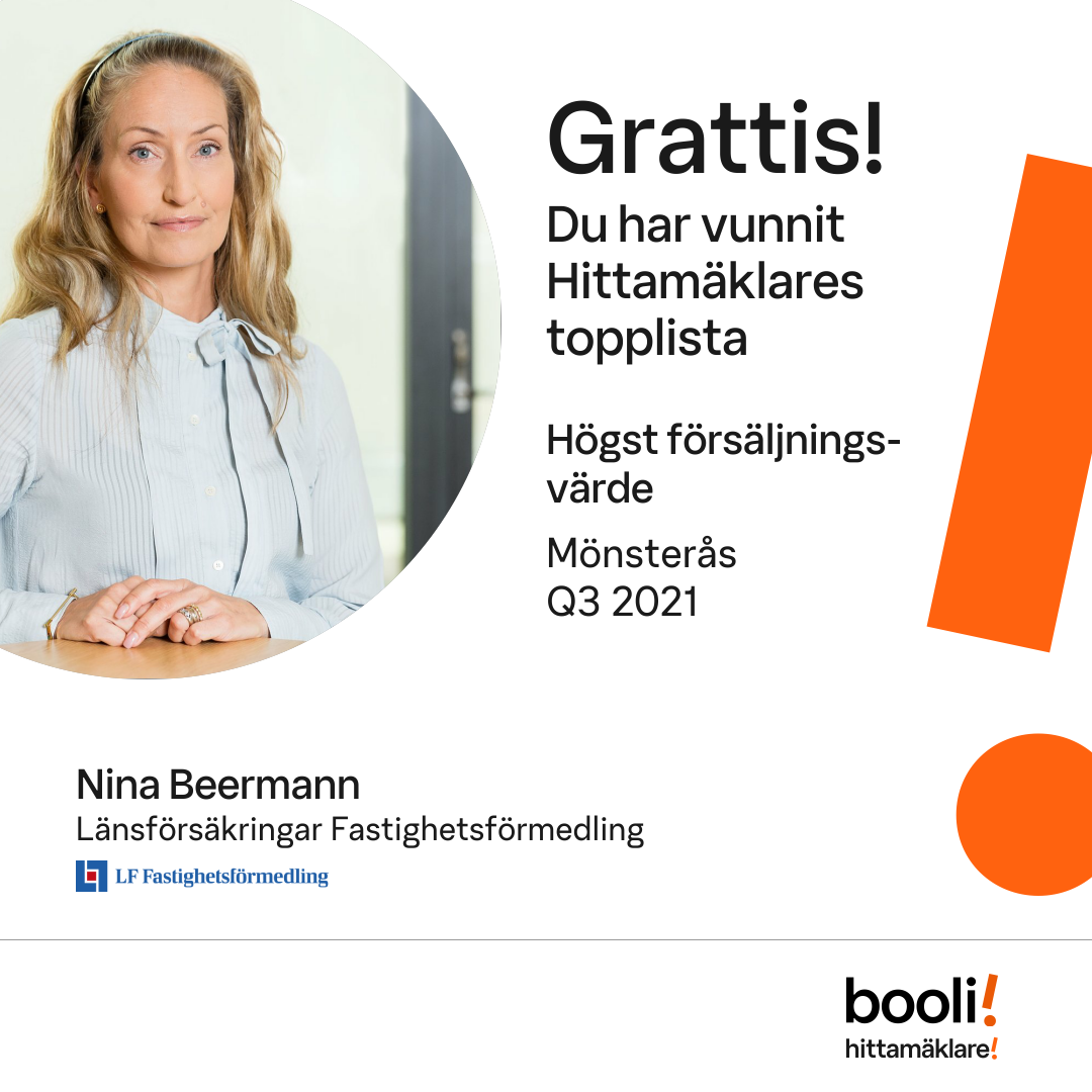 Statistik för publicerade bostäder, försäljningar och omdömen baseras på data från Booli och Hittamäklare. Statistiken för försäljningar avser inrapporterade och verifierade slutpriser från mäklare eller av Booli inhämtade och verifierade slutpriser. Statistiken för publicerade bostäder baseras på information som publicerats på Booli.se. Statistik för omdömen och rekommendationer baseras på omdömen från säljare som lämnats via Booli och Hittamäklare.