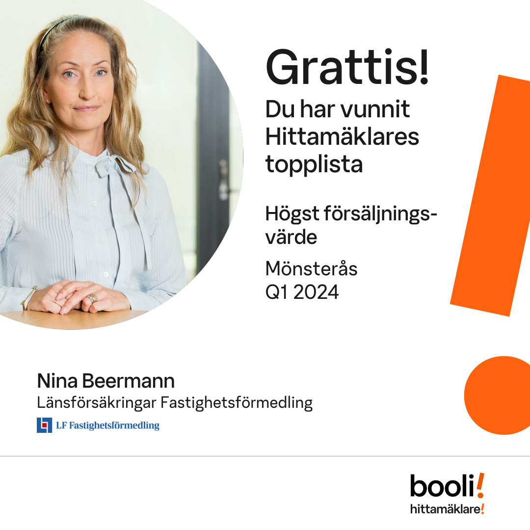 Statistik för publicerade bostäder, försäljningar och omdömen baseras på data från Booli. Statistiken för försäljningar avser inrapporterade och verifierade slutpriser från mäklare eller av Booli inhämtade och verifierade slutpriser. Statistiken för publicerade bostäder baseras på information som publicerats på Booli.se. Statistik för omdömen och rekommendationer baseras på omdömen från säljare som lämnats via Booli.