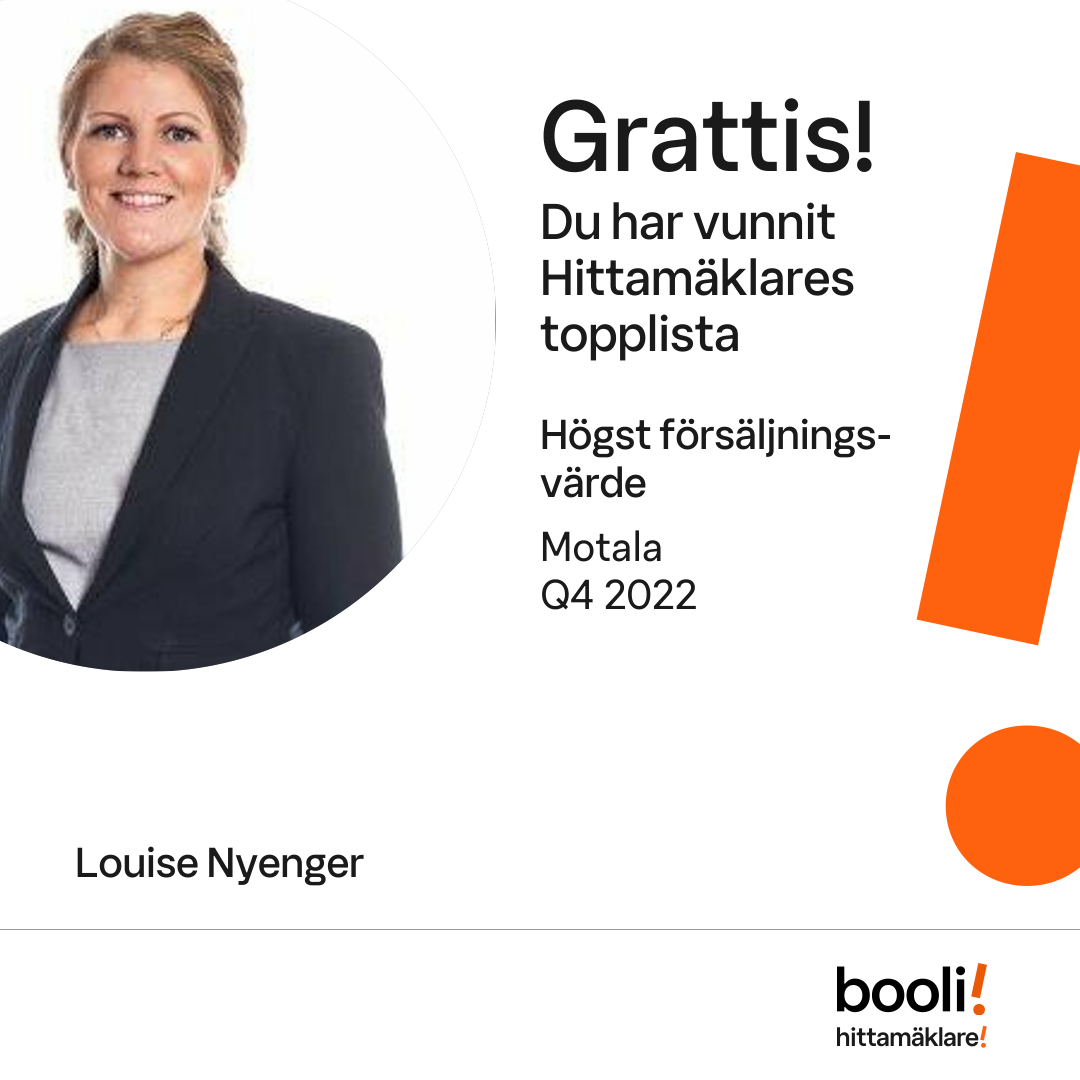 Statistik för publicerade bostäder, försäljningar och omdömen baseras på data från Booli och Hittamäklare. Statistiken för försäljningar avser inrapporterade och verifierade slutpriser från mäklare eller av Booli inhämtade och verifierade slutpriser. Statistiken för publicerade bostäder baseras på information som publicerats på Booli.se. Statistik för omdömen och rekommendationer baseras på omdömen från säljare som lämnats via Booli och Hittamäklare.