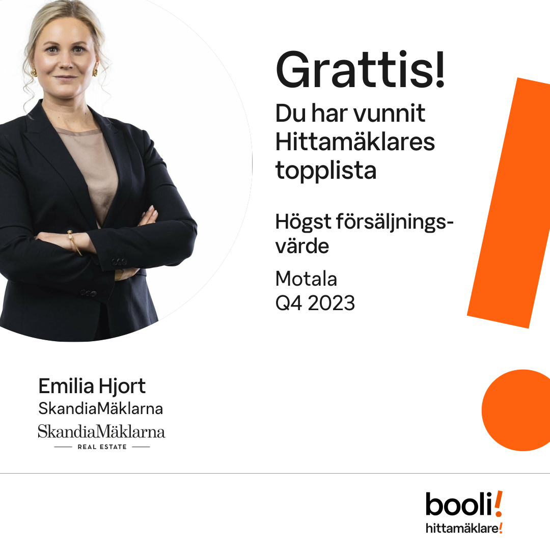 Statistik för publicerade bostäder, försäljningar och omdömen baseras på data från Booli och Hittamäklare. Statistiken för försäljningar avser inrapporterade och verifierade slutpriser från mäklare eller av Booli inhämtade och verifierade slutpriser. Statistiken för publicerade bostäder baseras på information som publicerats på Booli.se. Statistik för omdömen och rekommendationer baseras på omdömen från säljare som lämnats via Booli och Hittamäklare.
