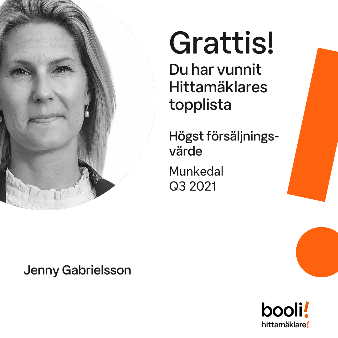 Statistik för publicerade bostäder, försäljningar och omdömen baseras på data från Booli och Hittamäklare. Statistiken för försäljningar avser inrapporterade och verifierade slutpriser från mäklare eller av Booli inhämtade och verifierade slutpriser. Statistiken för publicerade bostäder baseras på information som publicerats på Booli.se. Statistik för omdömen och rekommendationer baseras på omdömen från säljare som lämnats via Booli och Hittamäklare.