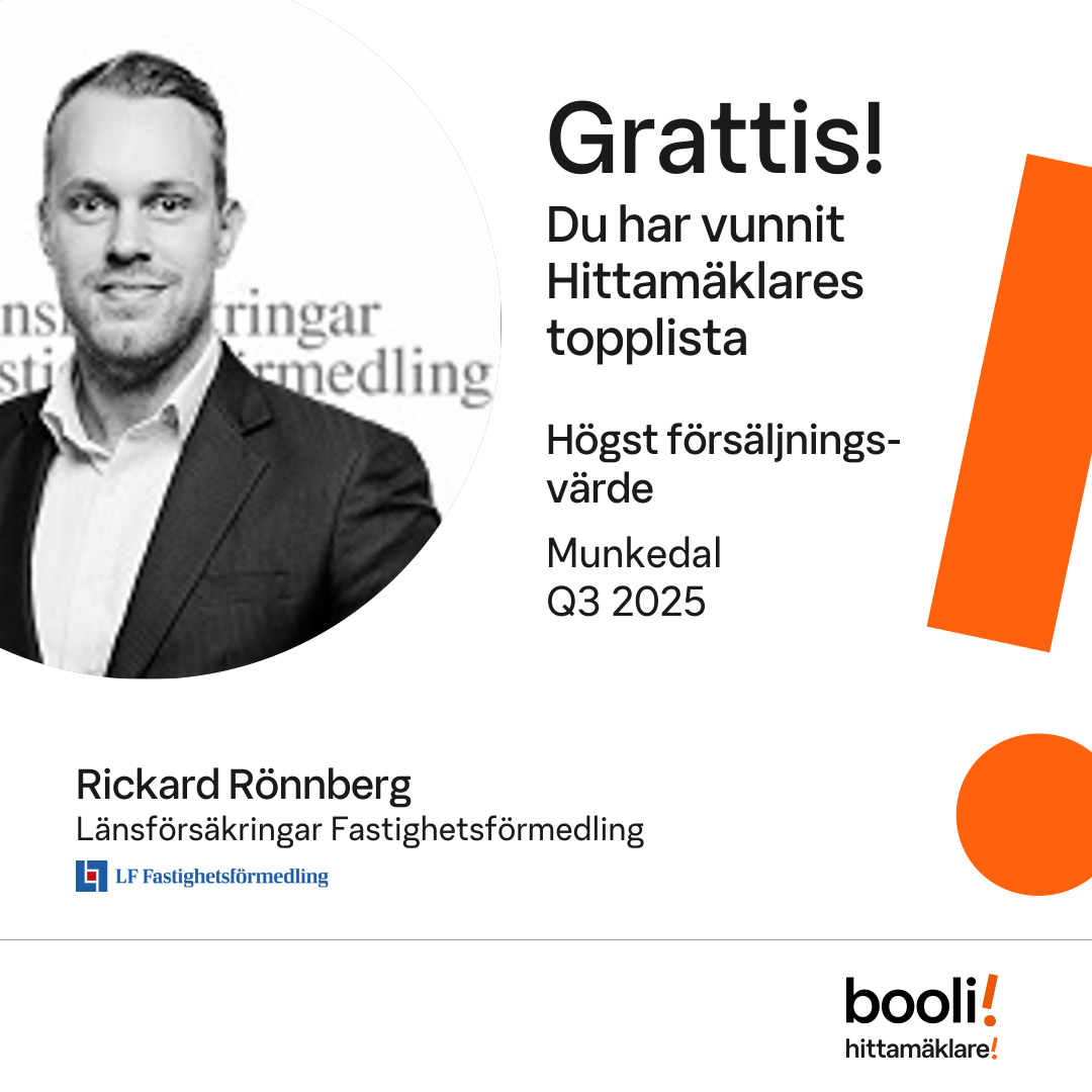 Statistik för publicerade bostäder, försäljningar och omdömen baseras på data från Booli och Hittamäklare. Statistiken för försäljningar avser inrapporterade och verifierade slutpriser från mäklare eller av Booli inhämtade och verifierade slutpriser. Statistiken för publicerade bostäder baseras på information som publicerats på Booli.se. Statistik för omdömen och rekommendationer baseras på omdömen från säljare som lämnats via Booli och Hittamäklare.
