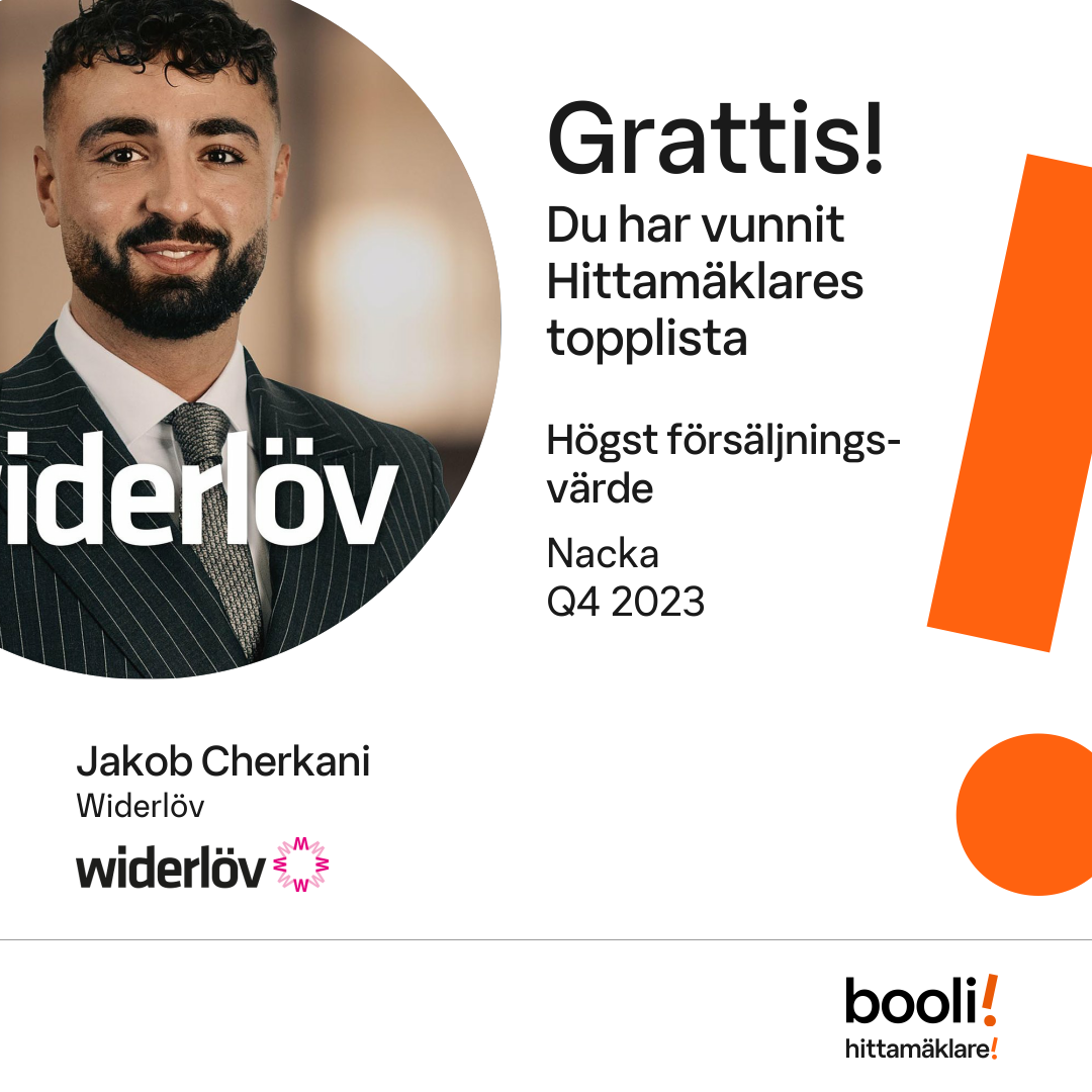 Statistik för publicerade bostäder, försäljningar och omdömen baseras på data från Booli och Hittamäklare. Statistiken för försäljningar avser inrapporterade och verifierade slutpriser från mäklare eller av Booli inhämtade och verifierade slutpriser. Statistiken för publicerade bostäder baseras på information som publicerats på Booli.se. Statistik för omdömen och rekommendationer baseras på omdömen från säljare som lämnats via Booli och Hittamäklare.
