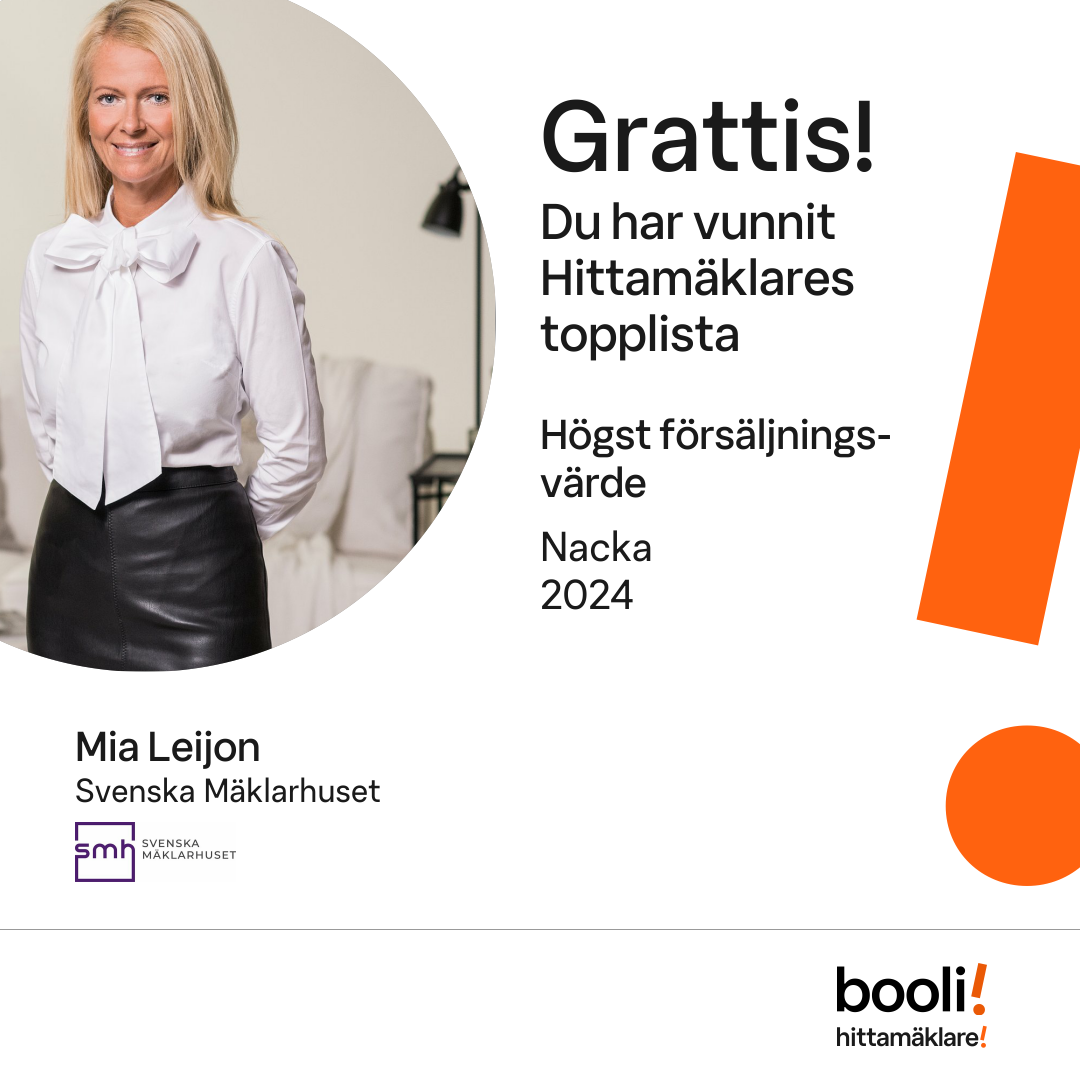 Statistik för publicerade bostäder, försäljningar och omdömen baseras på data från Booli och Hittamäklare. Statistiken för försäljningar avser inrapporterade och verifierade slutpriser från mäklare eller av Booli inhämtade och verifierade slutpriser. Statistiken för publicerade bostäder baseras på information som publicerats på Booli.se. Statistik för omdömen och rekommendationer baseras på omdömen från säljare som lämnats via Booli och Hittamäklare.
