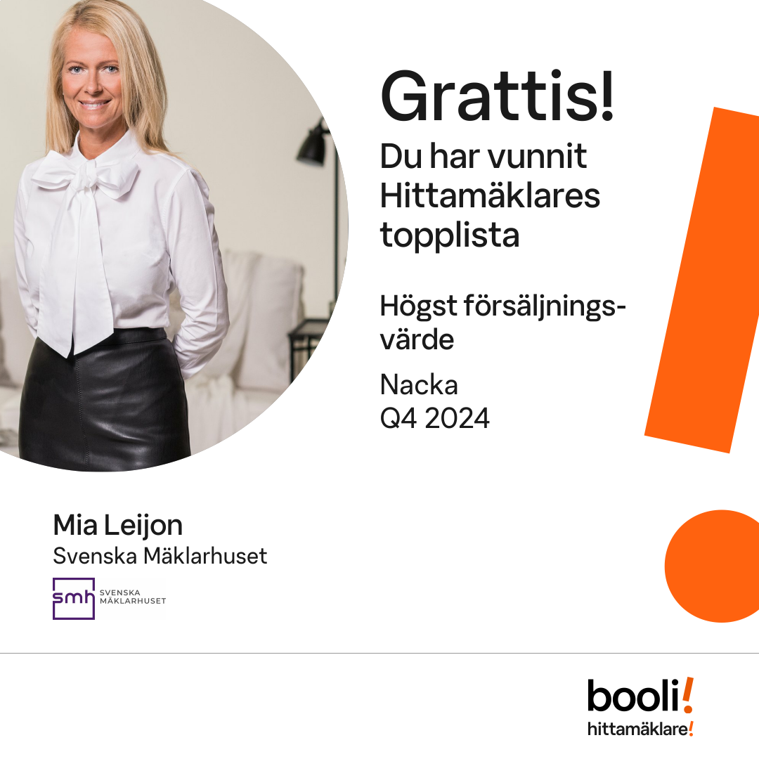 Statistik för publicerade bostäder, försäljningar och omdömen baseras på data från Booli och Hittamäklare. Statistiken för försäljningar avser inrapporterade och verifierade slutpriser från mäklare eller av Booli inhämtade och verifierade slutpriser. Statistiken för publicerade bostäder baseras på information som publicerats på Booli.se. Statistik för omdömen och rekommendationer baseras på omdömen från säljare som lämnats via Booli och Hittamäklare.