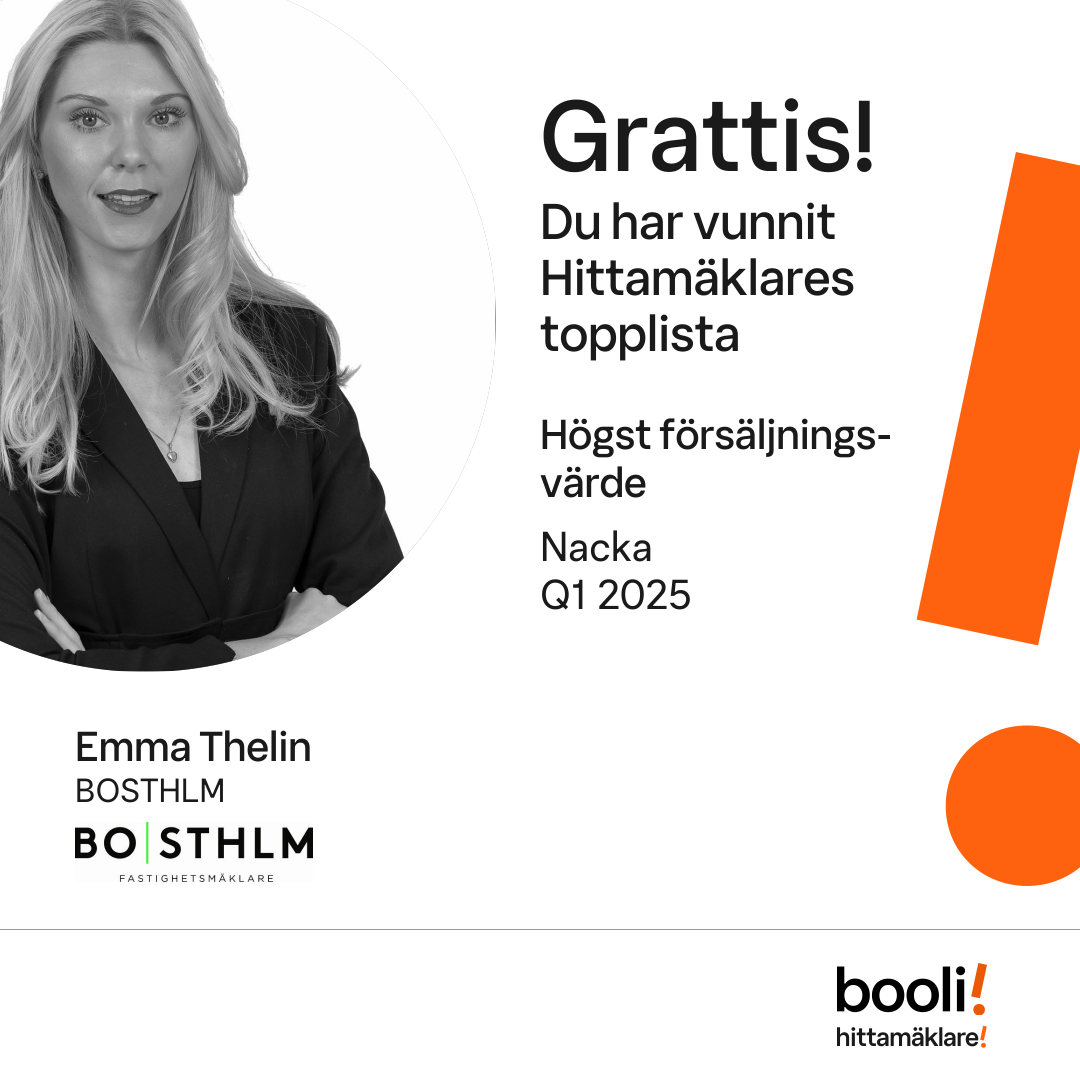 Statistik för publicerade bostäder, försäljningar och omdömen baseras på data från Booli och Hittamäklare. Statistiken för försäljningar avser inrapporterade och verifierade slutpriser från mäklare eller av Booli inhämtade och verifierade slutpriser. Statistiken för publicerade bostäder baseras på information som publicerats på Booli.se. Statistik för omdömen och rekommendationer baseras på omdömen från säljare som lämnats via Booli och Hittamäklare.