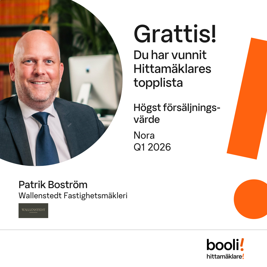 Statistik för publicerade bostäder, försäljningar och omdömen baseras på data från Booli. Statistiken för försäljningar avser inrapporterade och verifierade slutpriser från mäklare eller av Booli inhämtade och verifierade slutpriser. Statistiken för publicerade bostäder baseras på information som publicerats på Booli.se. Statistik för omdömen och rekommendationer baseras på omdömen från säljare som lämnats via Booli.