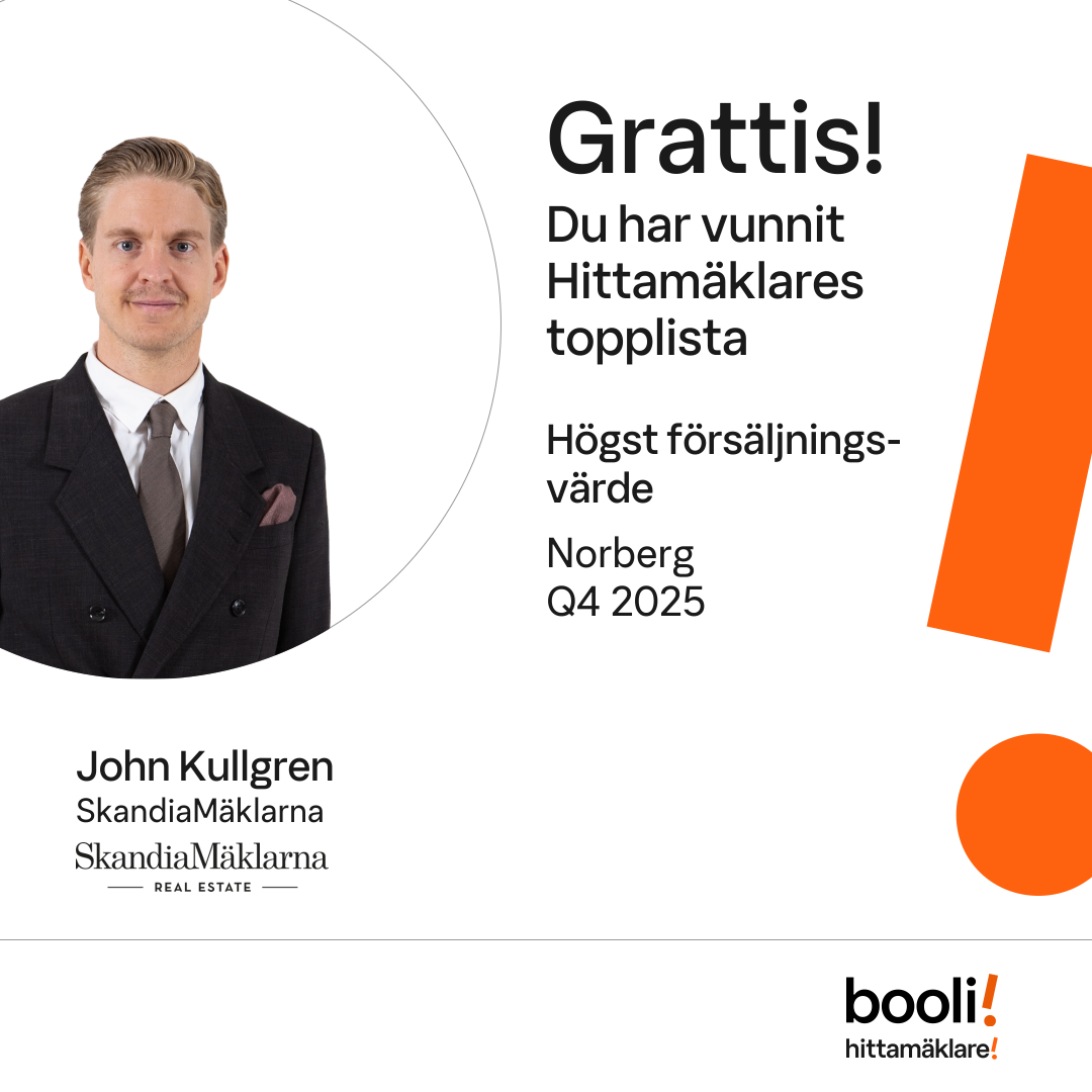 Statistik för publicerade bostäder, försäljningar och omdömen baseras på data från Booli och Hittamäklare. Statistiken för försäljningar avser inrapporterade och verifierade slutpriser från mäklare eller av Booli inhämtade och verifierade slutpriser. Statistiken för publicerade bostäder baseras på information som publicerats på Booli.se. Statistik för omdömen och rekommendationer baseras på omdömen från säljare som lämnats via Booli och Hittamäklare.