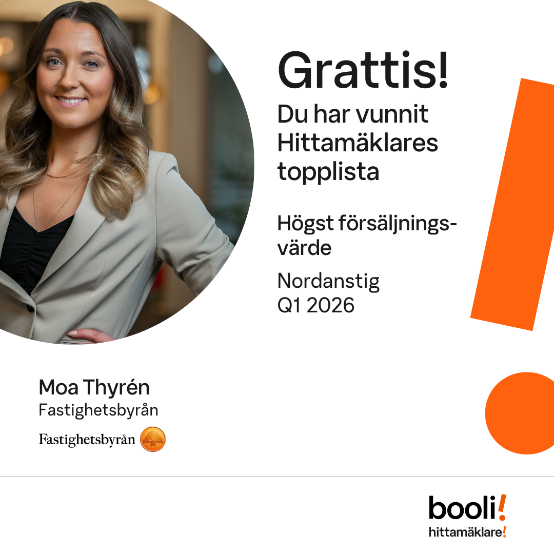 Statistik för publicerade bostäder, försäljningar och omdömen baseras på data från Booli. Statistiken för försäljningar avser inrapporterade och verifierade slutpriser från mäklare eller av Booli inhämtade och verifierade slutpriser. Statistiken för publicerade bostäder baseras på information som publicerats på Booli.se. Statistik för omdömen och rekommendationer baseras på omdömen från säljare som lämnats via Booli.