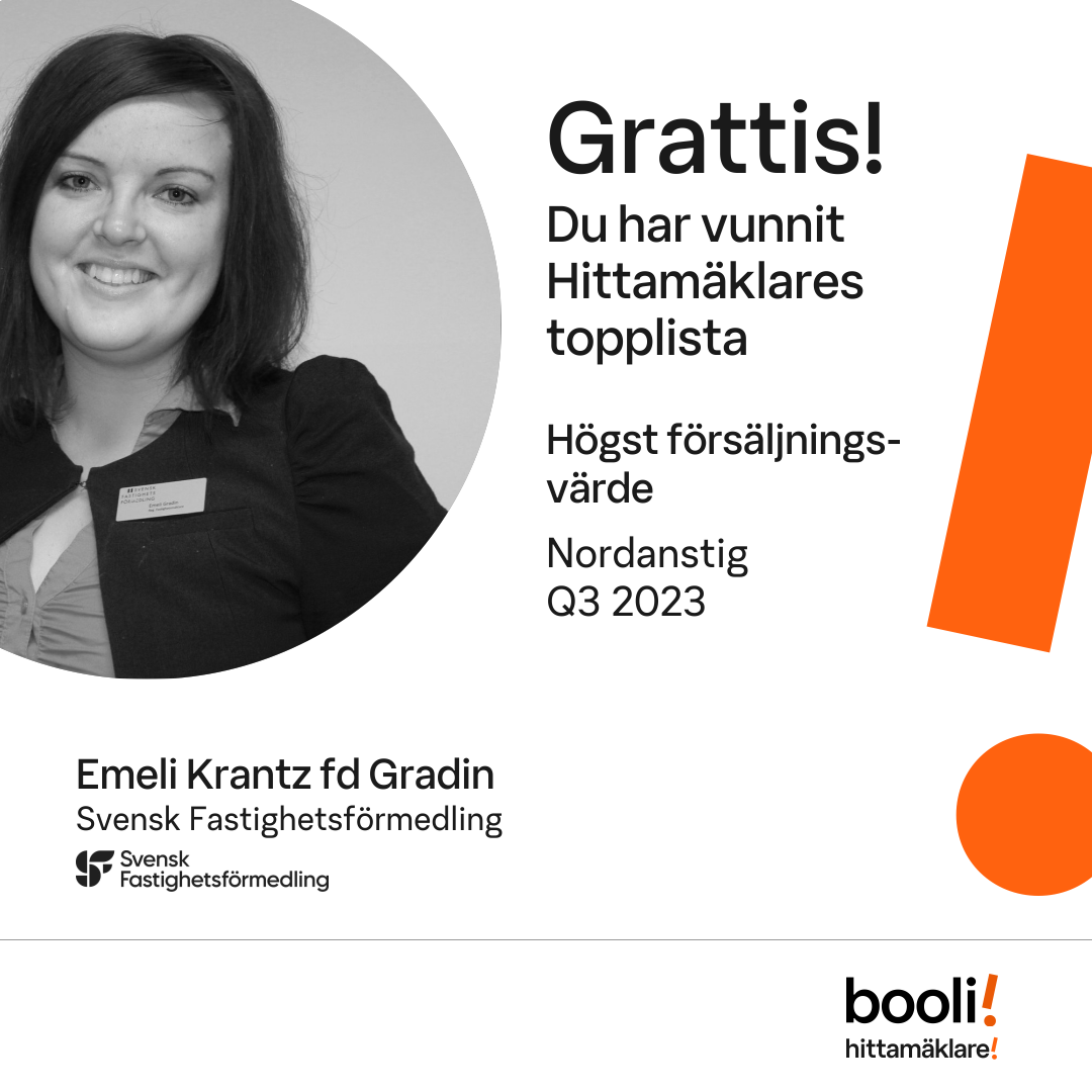 Statistik för publicerade bostäder, försäljningar och omdömen baseras på data från Booli och Hittamäklare. Statistiken för försäljningar avser inrapporterade och verifierade slutpriser från mäklare eller av Booli inhämtade och verifierade slutpriser. Statistiken för publicerade bostäder baseras på information som publicerats på Booli.se. Statistik för omdömen och rekommendationer baseras på omdömen från säljare som lämnats via Booli och Hittamäklare.