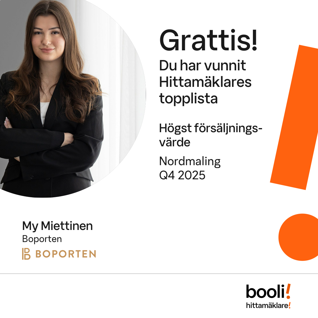 Statistik för publicerade bostäder, försäljningar och omdömen baseras på data från Booli och Hittamäklare. Statistiken för försäljningar avser inrapporterade och verifierade slutpriser från mäklare eller av Booli inhämtade och verifierade slutpriser. Statistiken för publicerade bostäder baseras på information som publicerats på Booli.se. Statistik för omdömen och rekommendationer baseras på omdömen från säljare som lämnats via Booli och Hittamäklare.