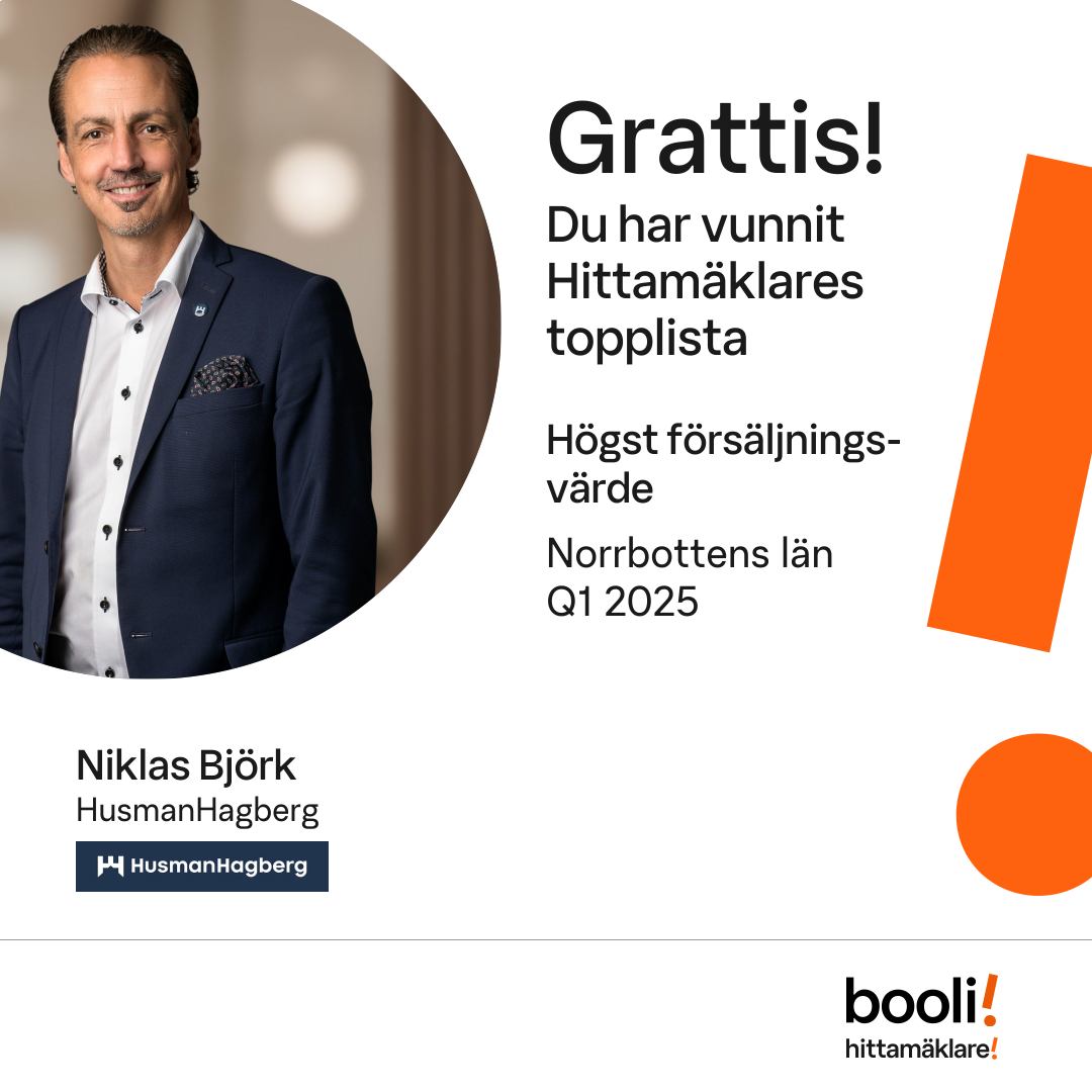 Statistik för publicerade bostäder, försäljningar och omdömen baseras på data från Booli och Hittamäklare. Statistiken för försäljningar avser inrapporterade och verifierade slutpriser från mäklare eller av Booli inhämtade och verifierade slutpriser. Statistiken för publicerade bostäder baseras på information som publicerats på Booli.se. Statistik för omdömen och rekommendationer baseras på omdömen från säljare som lämnats via Booli och Hittamäklare.