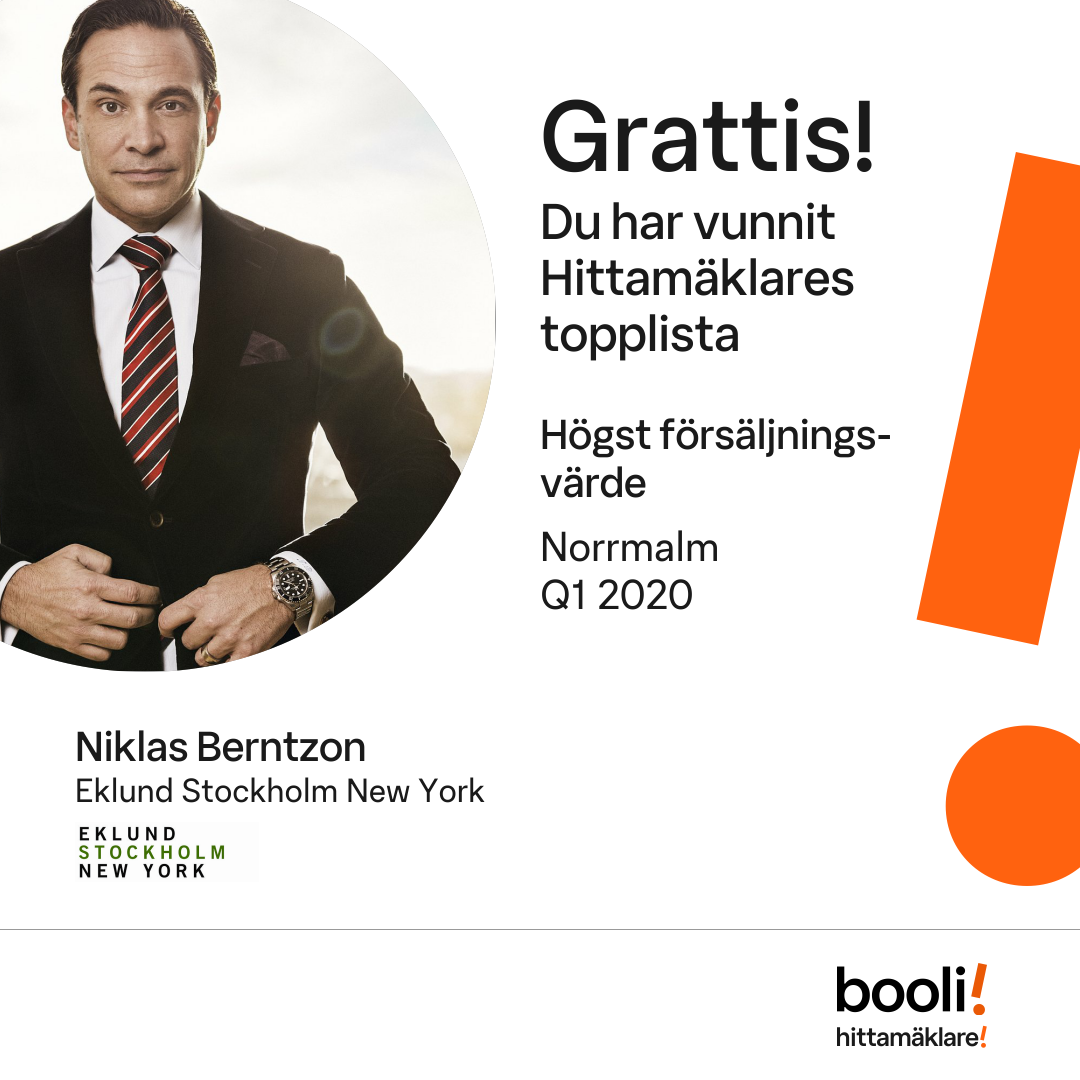 Statistik för publicerade bostäder, försäljningar och omdömen baseras på data från Booli och Hittamäklare. Statistiken för försäljningar avser inrapporterade och verifierade slutpriser från mäklare eller av Booli inhämtade och verifierade slutpriser. Statistiken för publicerade bostäder baseras på information som publicerats på Booli.se. Statistik för omdömen och rekommendationer baseras på omdömen från säljare som lämnats via Booli och Hittamäklare.