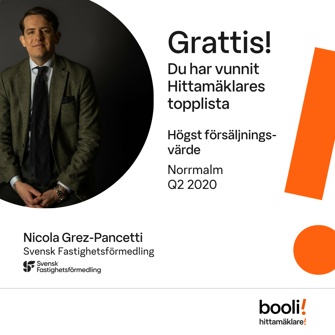 Statistik för publicerade bostäder, försäljningar och omdömen baseras på data från Booli och Hittamäklare. Statistiken för försäljningar avser inrapporterade och verifierade slutpriser från mäklare eller av Booli inhämtade och verifierade slutpriser. Statistiken för publicerade bostäder baseras på information som publicerats på Booli.se. Statistik för omdömen och rekommendationer baseras på omdömen från säljare som lämnats via Booli och Hittamäklare.