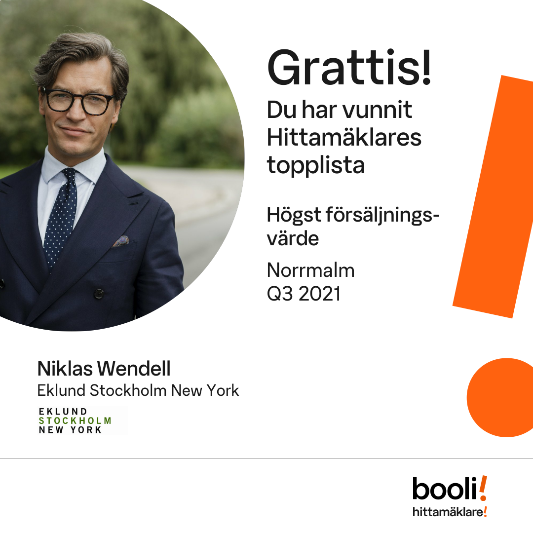 Statistik för publicerade bostäder, försäljningar och omdömen baseras på data från Booli och Hittamäklare. Statistiken för försäljningar avser inrapporterade och verifierade slutpriser från mäklare eller av Booli inhämtade och verifierade slutpriser. Statistiken för publicerade bostäder baseras på information som publicerats på Booli.se. Statistik för omdömen och rekommendationer baseras på omdömen från säljare som lämnats via Booli och Hittamäklare.