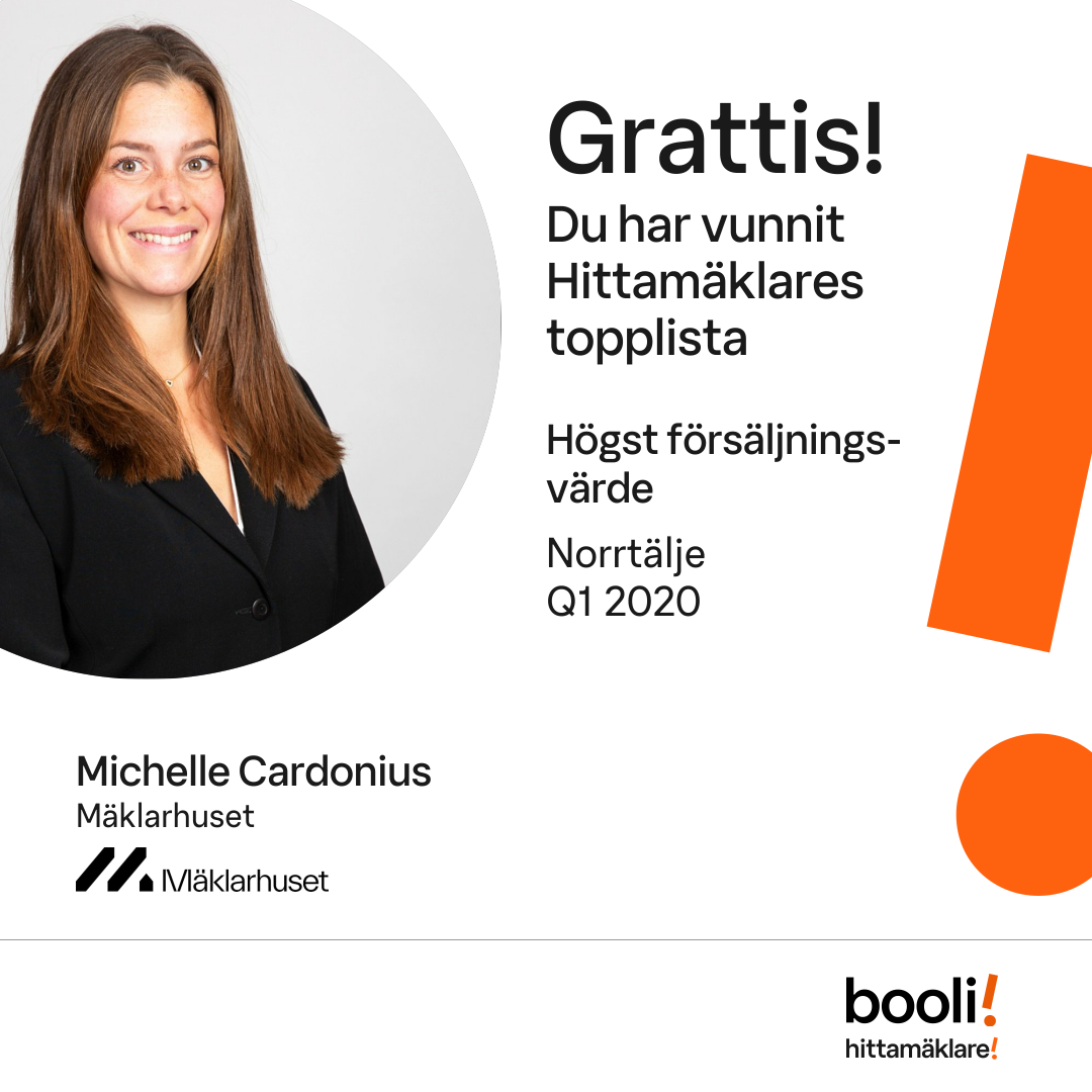 Statistik för publicerade bostäder, försäljningar och omdömen baseras på data från Booli och Hittamäklare. Statistiken för försäljningar avser inrapporterade och verifierade slutpriser från mäklare eller av Booli inhämtade och verifierade slutpriser. Statistiken för publicerade bostäder baseras på information som publicerats på Booli.se. Statistik för omdömen och rekommendationer baseras på omdömen från säljare som lämnats via Booli och Hittamäklare.