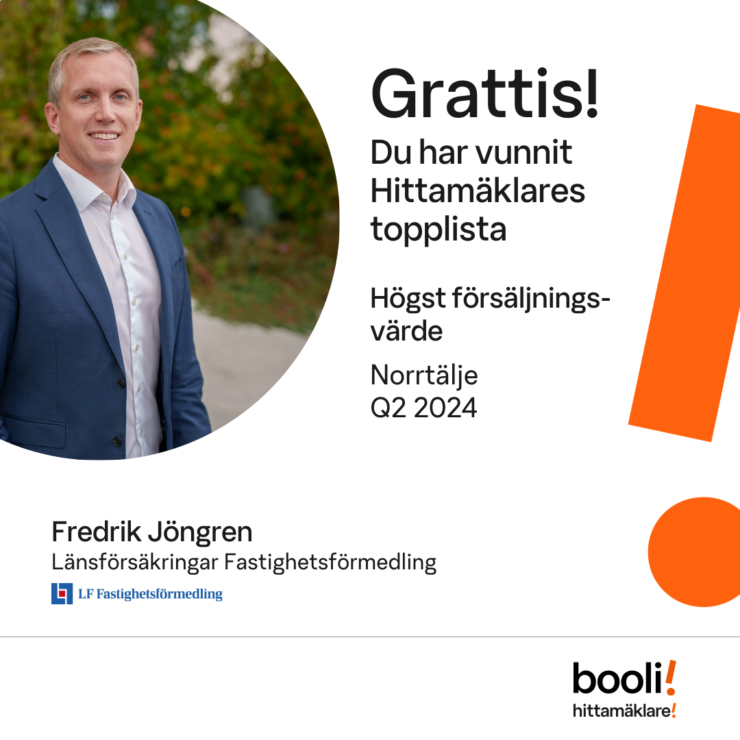 Statistik för publicerade bostäder, försäljningar och omdömen baseras på data från Booli och Hittamäklare. Statistiken för försäljningar avser inrapporterade och verifierade slutpriser från mäklare eller av Booli inhämtade och verifierade slutpriser. Statistiken för publicerade bostäder baseras på information som publicerats på Booli.se. Statistik för omdömen och rekommendationer baseras på omdömen från säljare som lämnats via Booli och Hittamäklare.