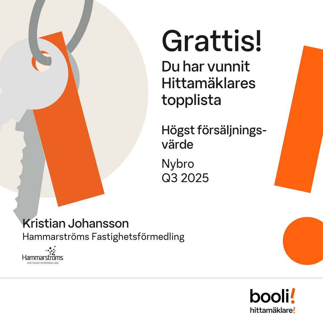 Statistik för publicerade bostäder, försäljningar och omdömen baseras på data från Booli och Hittamäklare. Statistiken för försäljningar avser inrapporterade och verifierade slutpriser från mäklare eller av Booli inhämtade och verifierade slutpriser. Statistiken för publicerade bostäder baseras på information som publicerats på Booli.se. Statistik för omdömen och rekommendationer baseras på omdömen från säljare som lämnats via Booli och Hittamäklare.