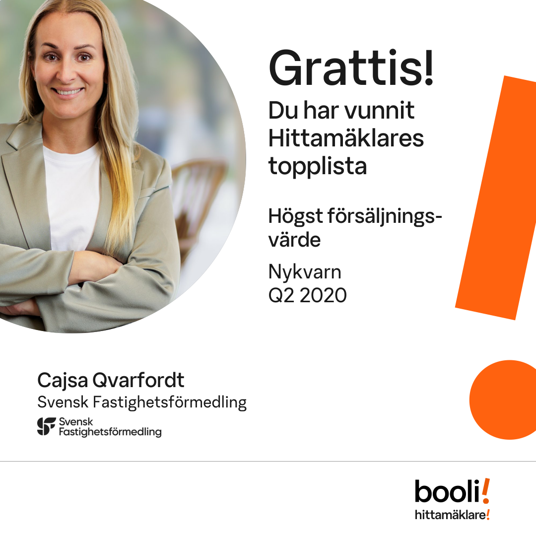 Statistik för publicerade bostäder, försäljningar och omdömen baseras på data från Booli och Hittamäklare. Statistiken för försäljningar avser inrapporterade och verifierade slutpriser från mäklare eller av Booli inhämtade och verifierade slutpriser. Statistiken för publicerade bostäder baseras på information som publicerats på Booli.se. Statistik för omdömen och rekommendationer baseras på omdömen från säljare som lämnats via Booli och Hittamäklare.