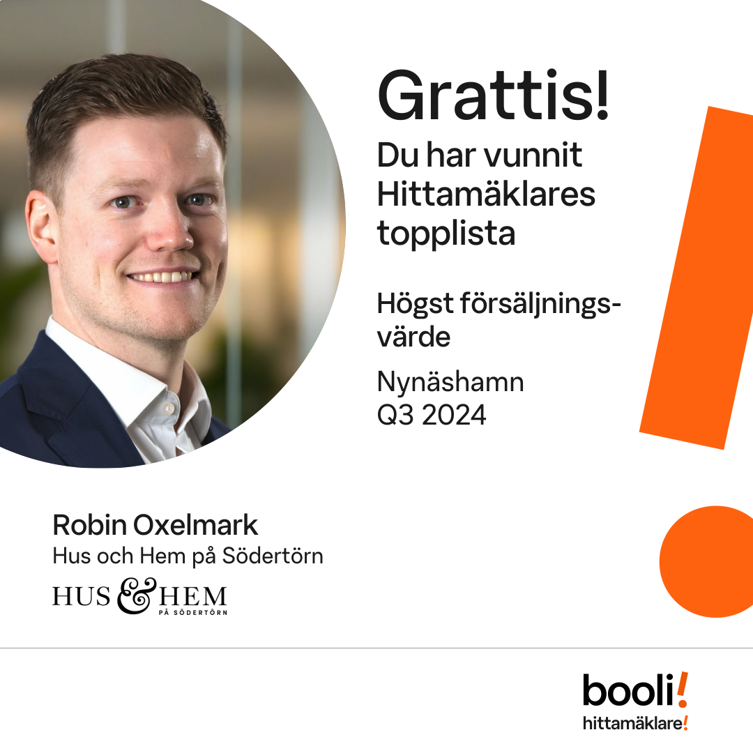 Statistik för publicerade bostäder, försäljningar och omdömen baseras på data från Booli och Hittamäklare. Statistiken för försäljningar avser inrapporterade och verifierade slutpriser från mäklare eller av Booli inhämtade och verifierade slutpriser. Statistiken för publicerade bostäder baseras på information som publicerats på Booli.se. Statistik för omdömen och rekommendationer baseras på omdömen från säljare som lämnats via Booli och Hittamäklare.
