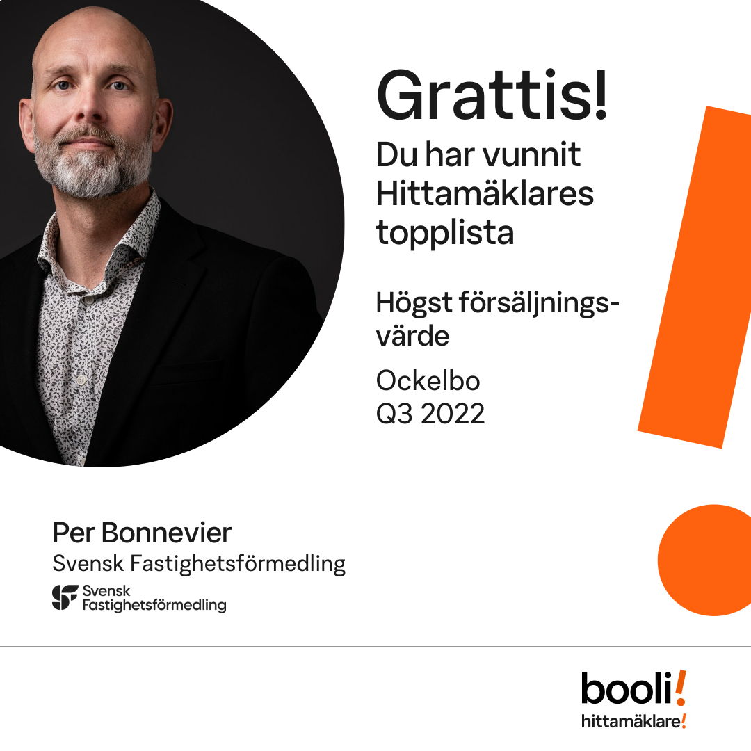 Statistik för publicerade bostäder, försäljningar och omdömen baseras på data från Booli och Hittamäklare. Statistiken för försäljningar avser inrapporterade och verifierade slutpriser från mäklare eller av Booli inhämtade och verifierade slutpriser. Statistiken för publicerade bostäder baseras på information som publicerats på Booli.se. Statistik för omdömen och rekommendationer baseras på omdömen från säljare som lämnats via Booli och Hittamäklare.