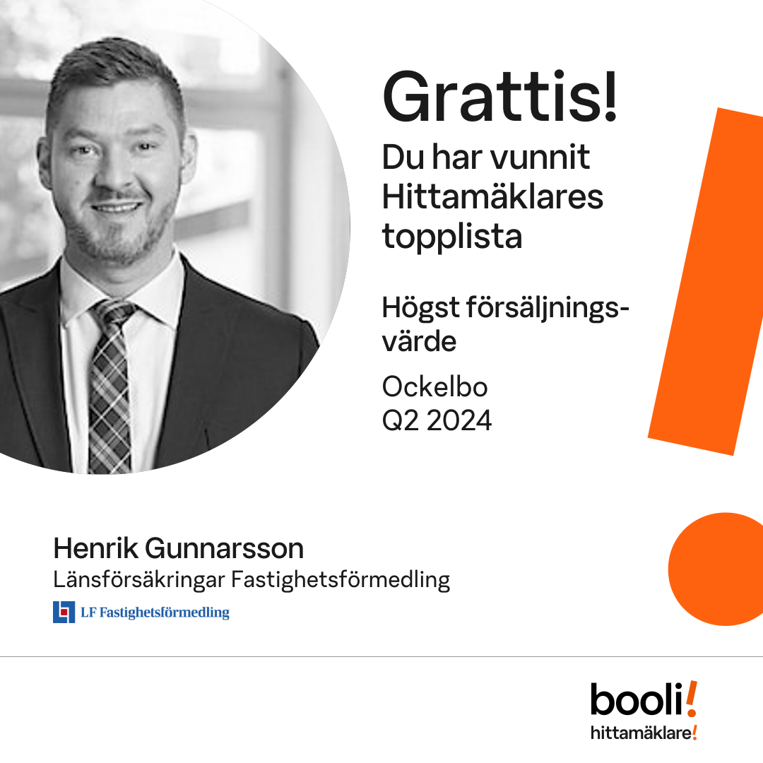 Statistik för publicerade bostäder, försäljningar och omdömen baseras på data från Booli och Hittamäklare. Statistiken för försäljningar avser inrapporterade och verifierade slutpriser från mäklare eller av Booli inhämtade och verifierade slutpriser. Statistiken för publicerade bostäder baseras på information som publicerats på Booli.se. Statistik för omdömen och rekommendationer baseras på omdömen från säljare som lämnats via Booli och Hittamäklare.