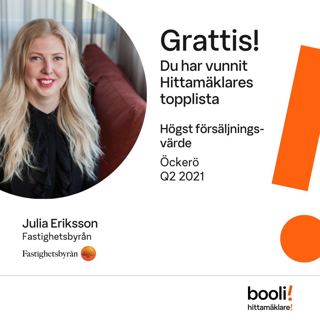 Statistik för publicerade bostäder, försäljningar och omdömen baseras på data från Booli och Hittamäklare. Statistiken för försäljningar avser inrapporterade och verifierade slutpriser från mäklare eller av Booli inhämtade och verifierade slutpriser. Statistiken för publicerade bostäder baseras på information som publicerats på Booli.se. Statistik för omdömen och rekommendationer baseras på omdömen från säljare som lämnats via Booli och Hittamäklare.
