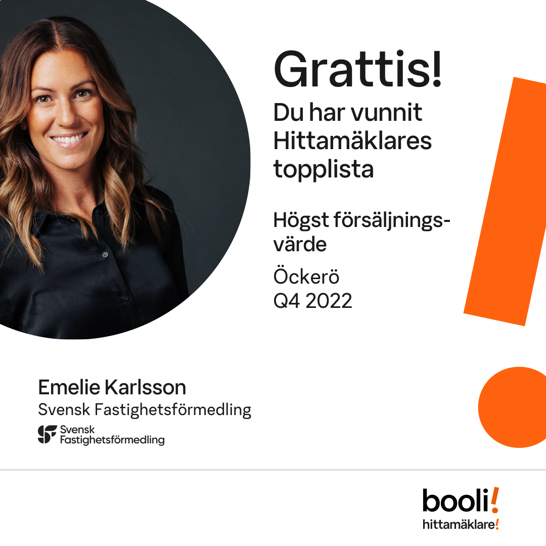 Statistik för publicerade bostäder, försäljningar och omdömen baseras på data från Booli och Hittamäklare. Statistiken för försäljningar avser inrapporterade och verifierade slutpriser från mäklare eller av Booli inhämtade och verifierade slutpriser. Statistiken för publicerade bostäder baseras på information som publicerats på Booli.se. Statistik för omdömen och rekommendationer baseras på omdömen från säljare som lämnats via Booli och Hittamäklare.
