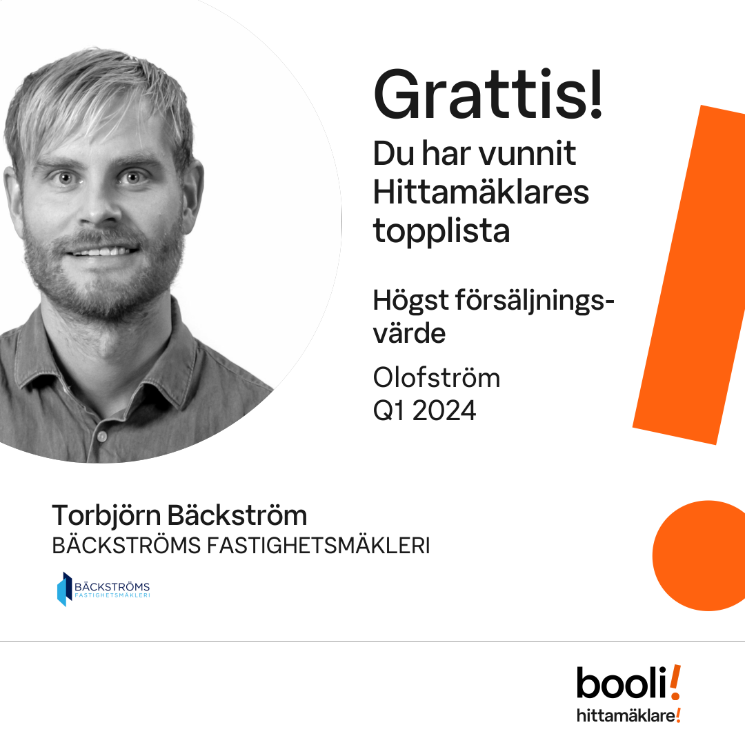 Statistik för publicerade bostäder, försäljningar och omdömen baseras på data från Booli och Hittamäklare. Statistiken för försäljningar avser inrapporterade och verifierade slutpriser från mäklare eller av Booli inhämtade och verifierade slutpriser. Statistiken för publicerade bostäder baseras på information som publicerats på Booli.se. Statistik för omdömen och rekommendationer baseras på omdömen från säljare som lämnats via Booli och Hittamäklare.