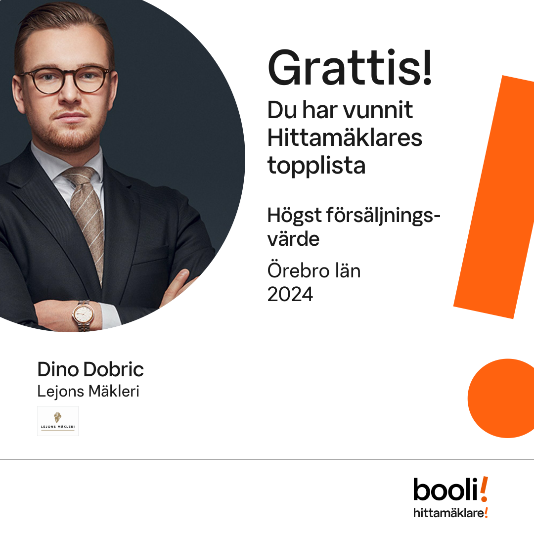 Statistik för publicerade bostäder, försäljningar och omdömen baseras på data från Booli och Hittamäklare. Statistiken för försäljningar avser inrapporterade och verifierade slutpriser från mäklare eller av Booli inhämtade och verifierade slutpriser. Statistiken för publicerade bostäder baseras på information som publicerats på Booli.se. Statistik för omdömen och rekommendationer baseras på omdömen från säljare som lämnats via Booli och Hittamäklare.
