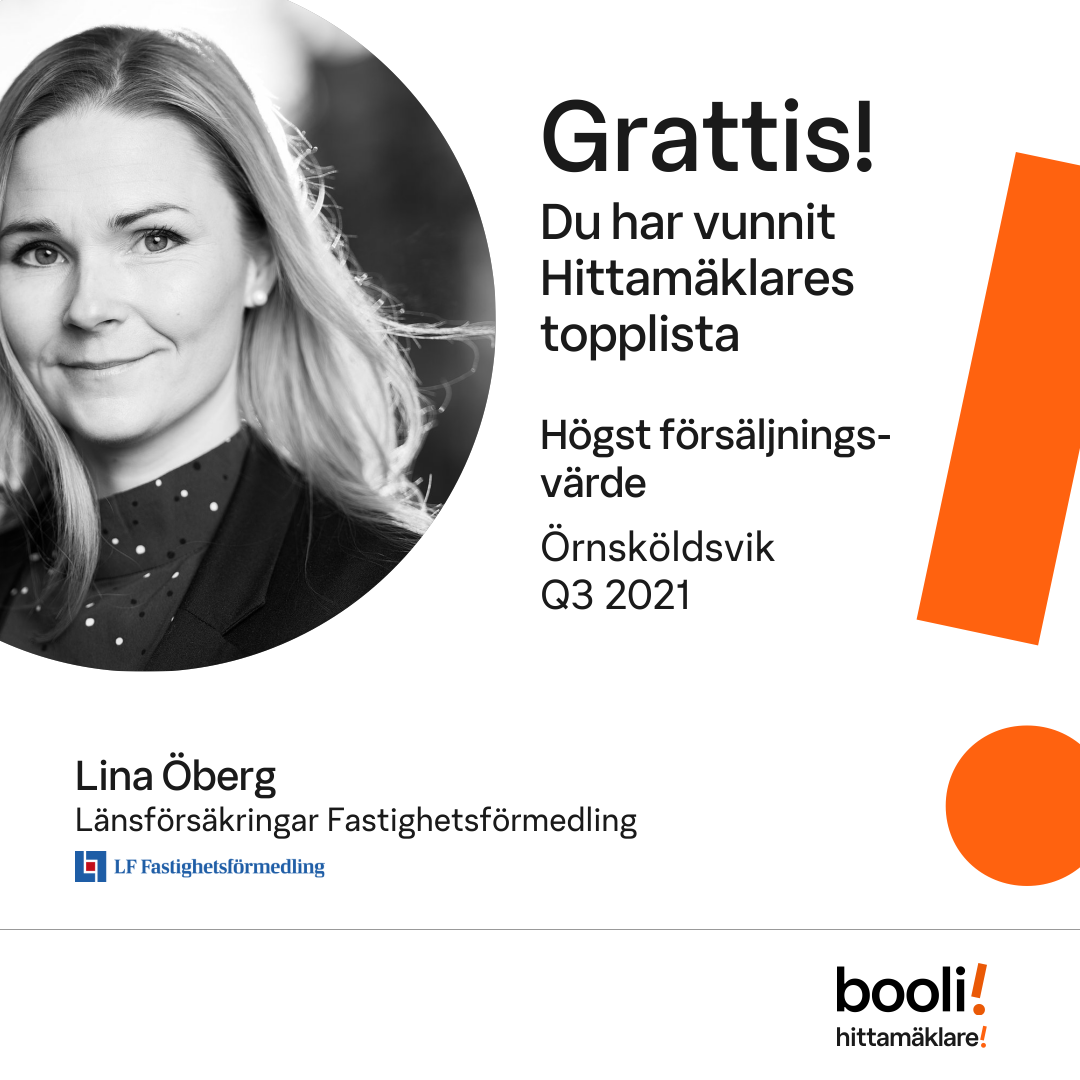 Statistik för publicerade bostäder, försäljningar och omdömen baseras på data från Booli och Hittamäklare. Statistiken för försäljningar avser inrapporterade och verifierade slutpriser från mäklare eller av Booli inhämtade och verifierade slutpriser. Statistiken för publicerade bostäder baseras på information som publicerats på Booli.se. Statistik för omdömen och rekommendationer baseras på omdömen från säljare som lämnats via Booli och Hittamäklare.