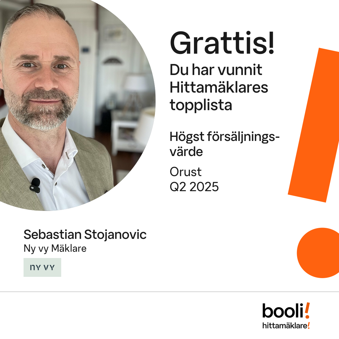 Statistik för publicerade bostäder, försäljningar och omdömen baseras på data från Booli och Hittamäklare. Statistiken för försäljningar avser inrapporterade och verifierade slutpriser från mäklare eller av Booli inhämtade och verifierade slutpriser. Statistiken för publicerade bostäder baseras på information som publicerats på Booli.se. Statistik för omdömen och rekommendationer baseras på omdömen från säljare som lämnats via Booli och Hittamäklare.