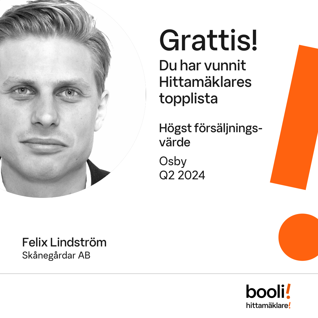 Statistik för publicerade bostäder, försäljningar och omdömen baseras på data från Booli och Hittamäklare. Statistiken för försäljningar avser inrapporterade och verifierade slutpriser från mäklare eller av Booli inhämtade och verifierade slutpriser. Statistiken för publicerade bostäder baseras på information som publicerats på Booli.se. Statistik för omdömen och rekommendationer baseras på omdömen från säljare som lämnats via Booli och Hittamäklare.