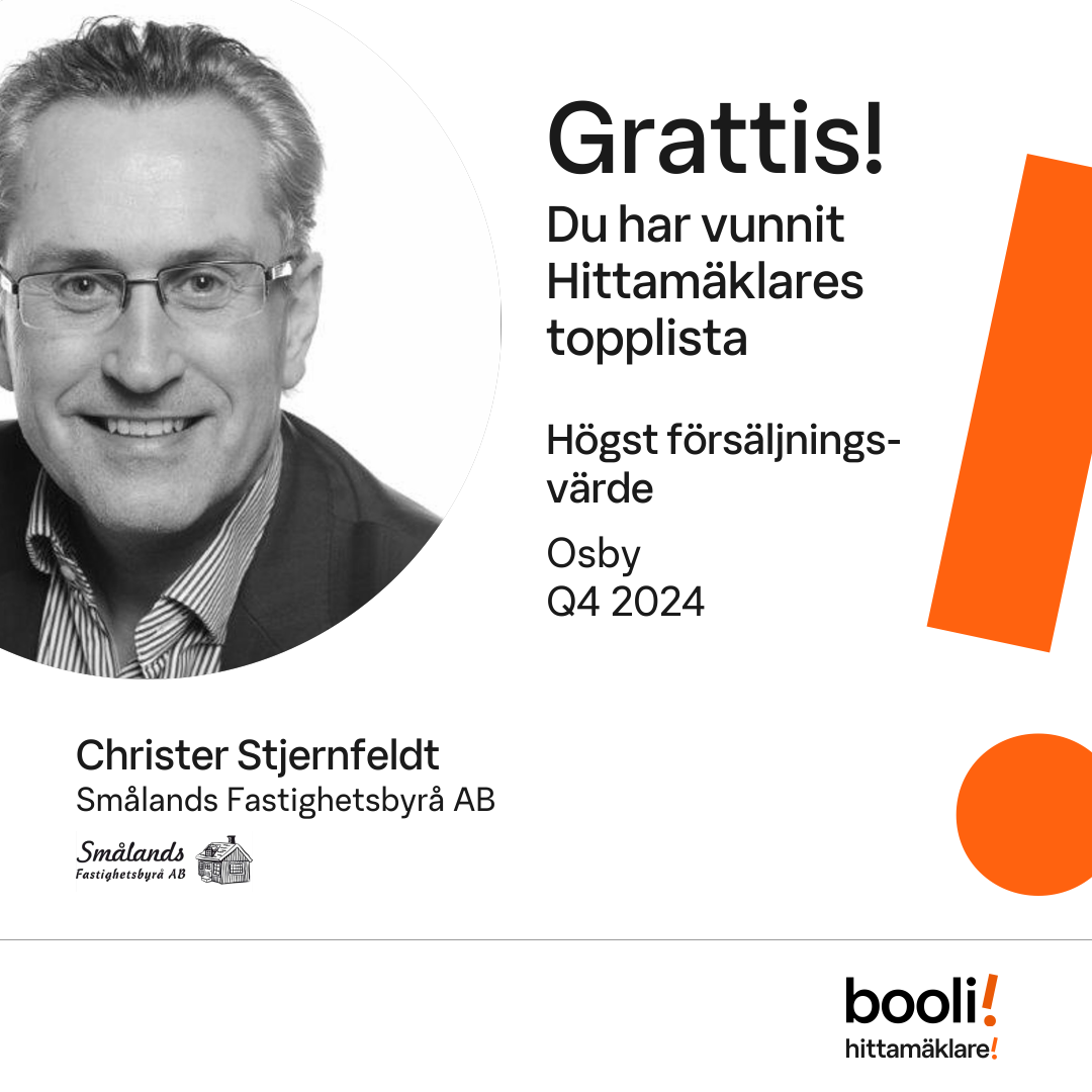 Statistik för publicerade bostäder, försäljningar och omdömen baseras på data från Booli och Hittamäklare. Statistiken för försäljningar avser inrapporterade och verifierade slutpriser från mäklare eller av Booli inhämtade och verifierade slutpriser. Statistiken för publicerade bostäder baseras på information som publicerats på Booli.se. Statistik för omdömen och rekommendationer baseras på omdömen från säljare som lämnats via Booli och Hittamäklare.