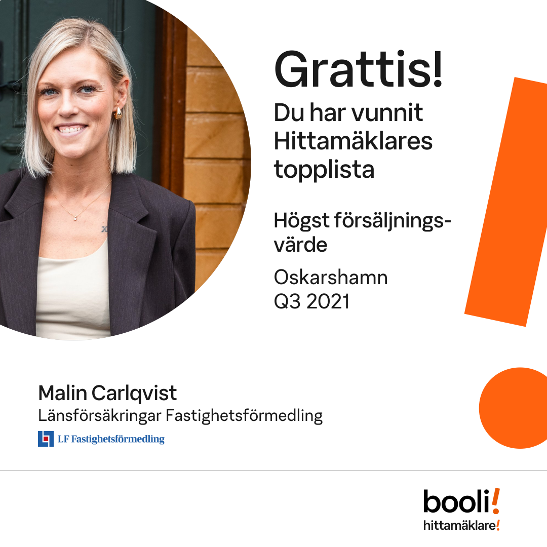 Statistik för publicerade bostäder, försäljningar och omdömen baseras på data från Booli och Hittamäklare. Statistiken för försäljningar avser inrapporterade och verifierade slutpriser från mäklare eller av Booli inhämtade och verifierade slutpriser. Statistiken för publicerade bostäder baseras på information som publicerats på Booli.se. Statistik för omdömen och rekommendationer baseras på omdömen från säljare som lämnats via Booli och Hittamäklare.