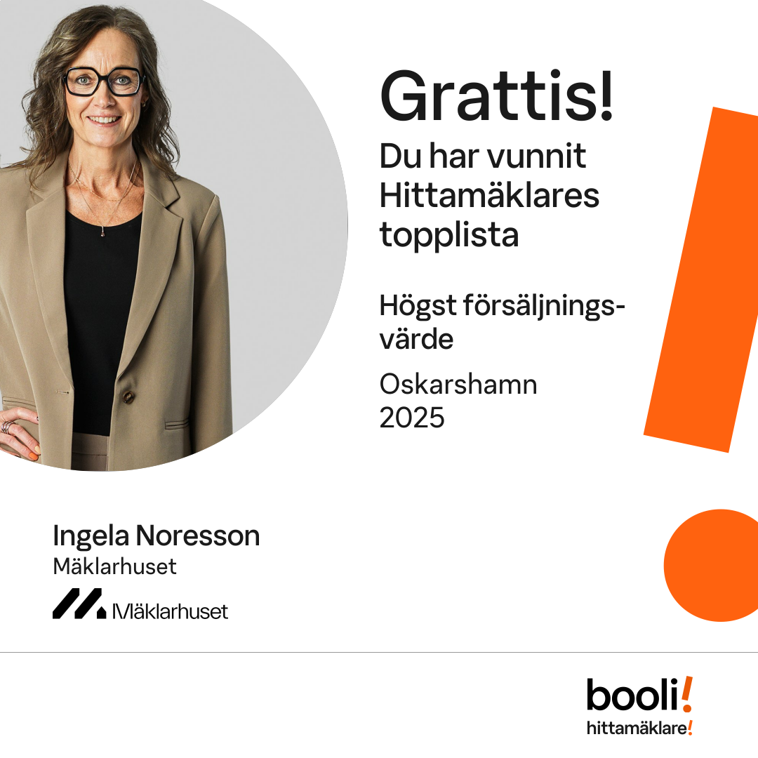 Statistik för publicerade bostäder, försäljningar och omdömen baseras på data från Booli och Hittamäklare. Statistiken för försäljningar avser inrapporterade och verifierade slutpriser från mäklare eller av Booli inhämtade och verifierade slutpriser. Statistiken för publicerade bostäder baseras på information som publicerats på Booli.se. Statistik för omdömen och rekommendationer baseras på omdömen från säljare som lämnats via Booli och Hittamäklare.