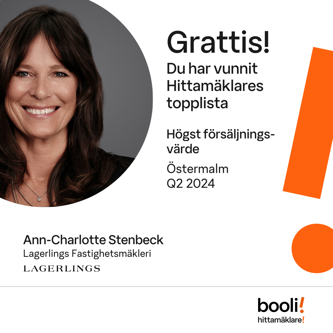 Statistik för publicerade bostäder, försäljningar och omdömen baseras på data från Booli och Hittamäklare. Statistiken för försäljningar avser inrapporterade och verifierade slutpriser från mäklare eller av Booli inhämtade och verifierade slutpriser. Statistiken för publicerade bostäder baseras på information som publicerats på Booli.se. Statistik för omdömen och rekommendationer baseras på omdömen från säljare som lämnats via Booli och Hittamäklare.