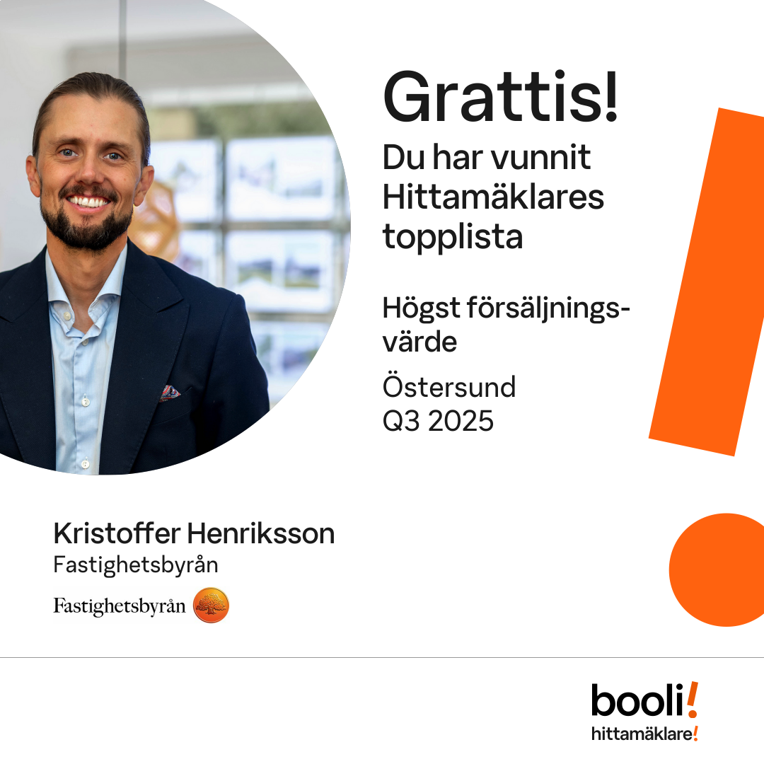 Statistik för publicerade bostäder, försäljningar och omdömen baseras på data från Booli och Hittamäklare. Statistiken för försäljningar avser inrapporterade och verifierade slutpriser från mäklare eller av Booli inhämtade och verifierade slutpriser. Statistiken för publicerade bostäder baseras på information som publicerats på Booli.se. Statistik för omdömen och rekommendationer baseras på omdömen från säljare som lämnats via Booli och Hittamäklare.